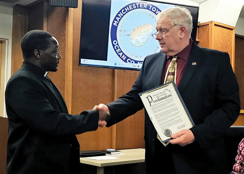 The 50th anniversary of Saint Elizabeth Ann Seton Catholic Church in Whiting was recognized during a recent Township Council meeting. Reverend Evarist Kabagambe (left) received a proclamation from Mayor Joseph Hankins.