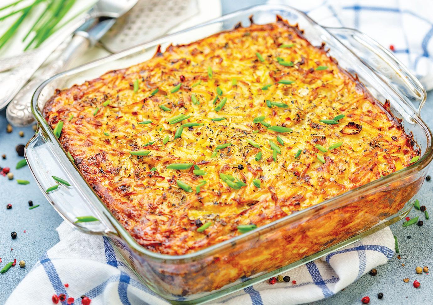 5. Placetheremaining 1/4 cup butter, margarine, oil orchicken fat into a 9-by-13- inch baking dish. Place in the oven forabout 5 to 7 minutes oruntil the fat is very hot. Remove from the oven with potholders and pour in the potato-vegetable batter. Spread evenly with a rubber spatula. Return to the oven and bake uncovered for about 50 to 60 minutes or until the top is nicely browned and crisp. Garnish with chives or scallions. Cut into squares and serve.