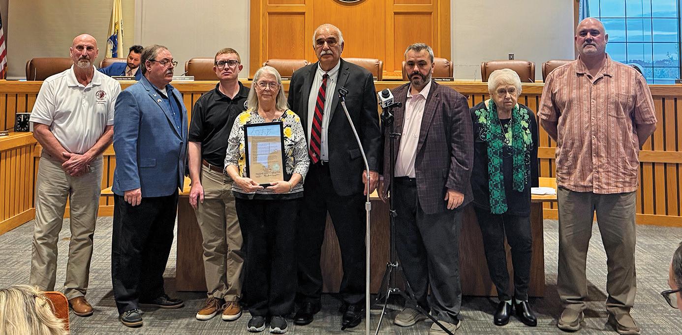 Renee Lomell holds the proclamation honoring her father, WWII hero Leonard “Bud” Lomell, surrounded by the mayor and members of the Township Council following a presentation at Town Hall.