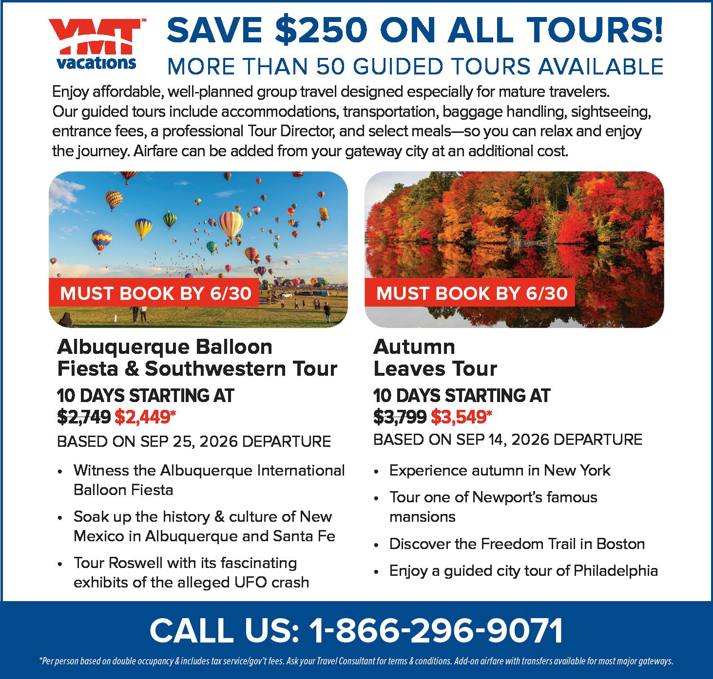 YMT Vacations. Over 50 guided tours available. Affordable, social and stressfree travel designed for mature travelers. Our tours include accommodations, transportation, baggage handling, sightseeing, entrance fees, a professional Tour Director and select meals. For a limited time SAVE $250 on all tours. Call YMT today. 1-866-296-9071. (t/n)