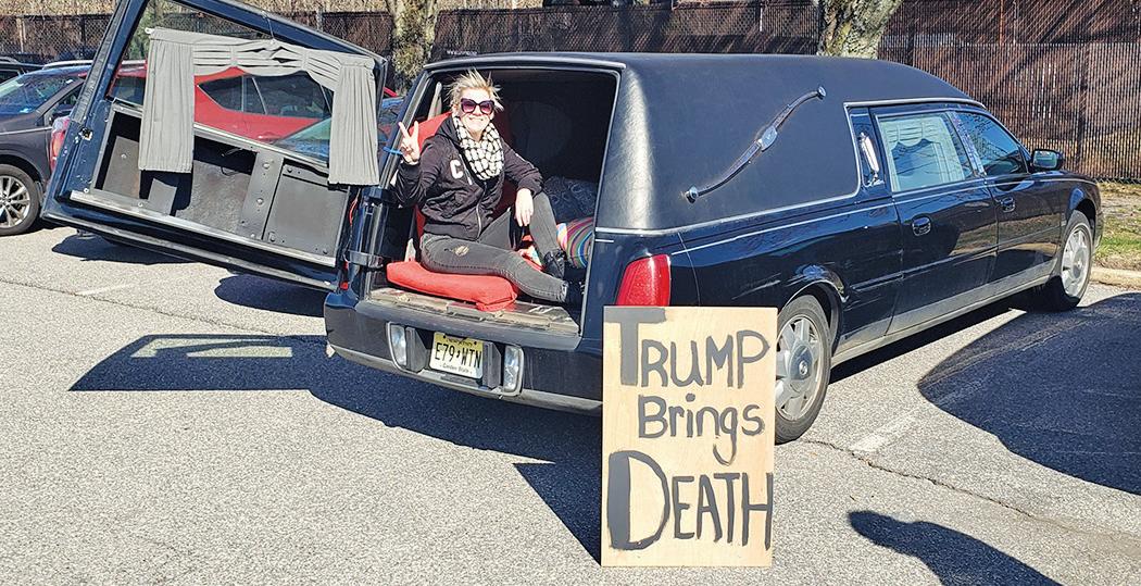 Casey Wolf of Lacey brought a hearse that she owns to the Lacey rally, parking it where people could see it as they headed to the rally point. She had a sign that stated “Trump Brings Death.”