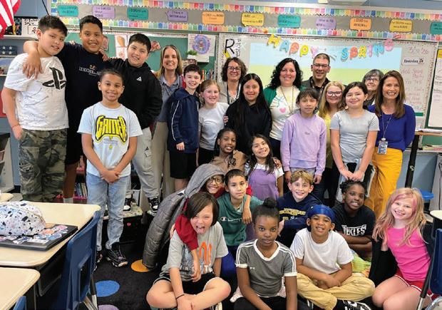 Fourth grade Ridgeway Elementary School teacher Melissa Tierney joins her students and Manchester School District Superintendent Diane Pedroza (at far right) after being recognized as the district’s Staff Mentor of the Year.