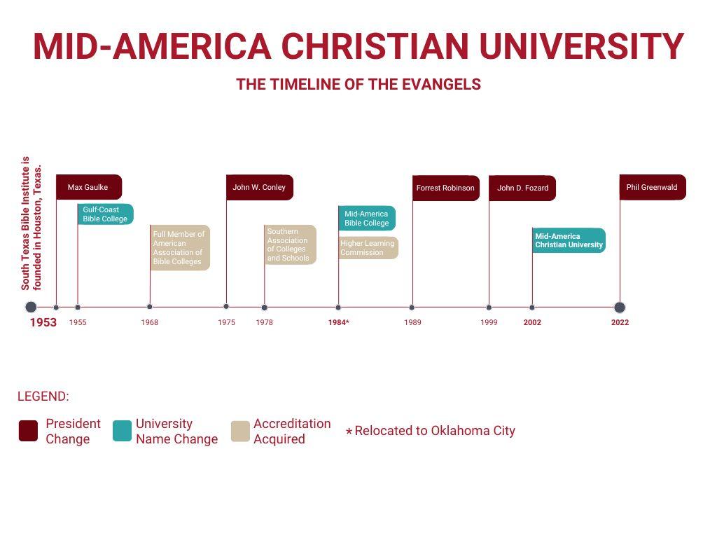 Mid-America Christian University was established originally as South Texas Bible Institute (STBI), in Houston, Texas, on September 14, 1953, by Dr. Max R. Gaulke. The college utilized the facilities of the First Church of God. Dr. Gaulke served as president from 1953-1975. The first class at STBI began with twenty-six students. Not only did the Institute steadily grow in popularity among those seeking pastoral and ministry training, but also among those in the community seeking higher education from a Christian perspective.
