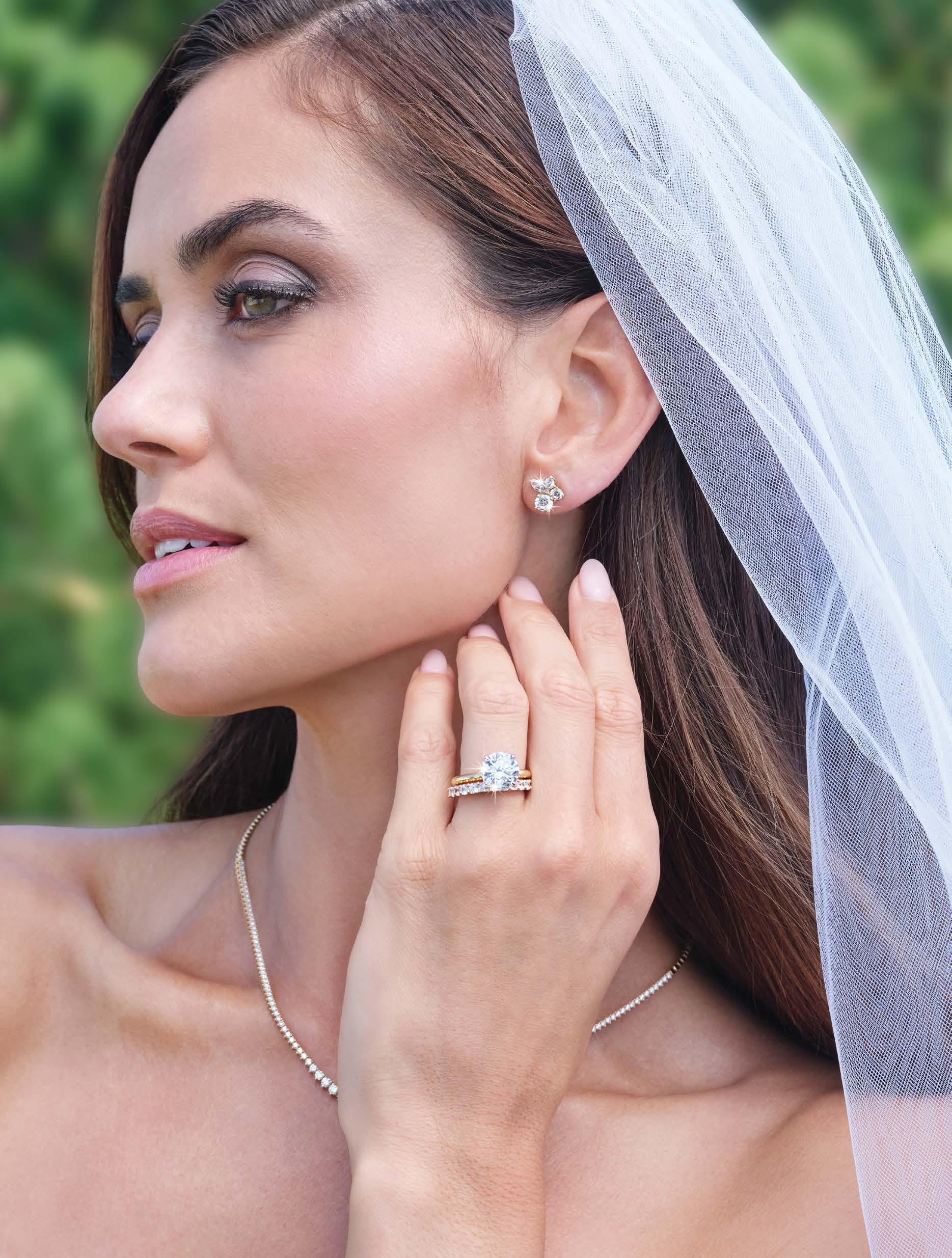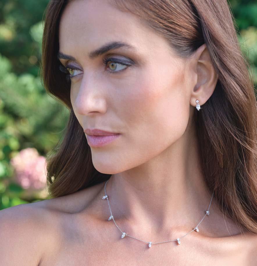 Studs (1 tcw) TM030836 | Orchid Pave Ring MB000275 | Emerald Diamond Full Tennis Straight Necklace TM029623 | Round Diamond Shared-Prong Band MB000388 Gardenia Ring MB000278 | Pear & Round Diamond Studs (1 tcw) TM030818 | Pear & Round Diamond Station Necklace (2 tcw) TM030809 | Opposite Page: