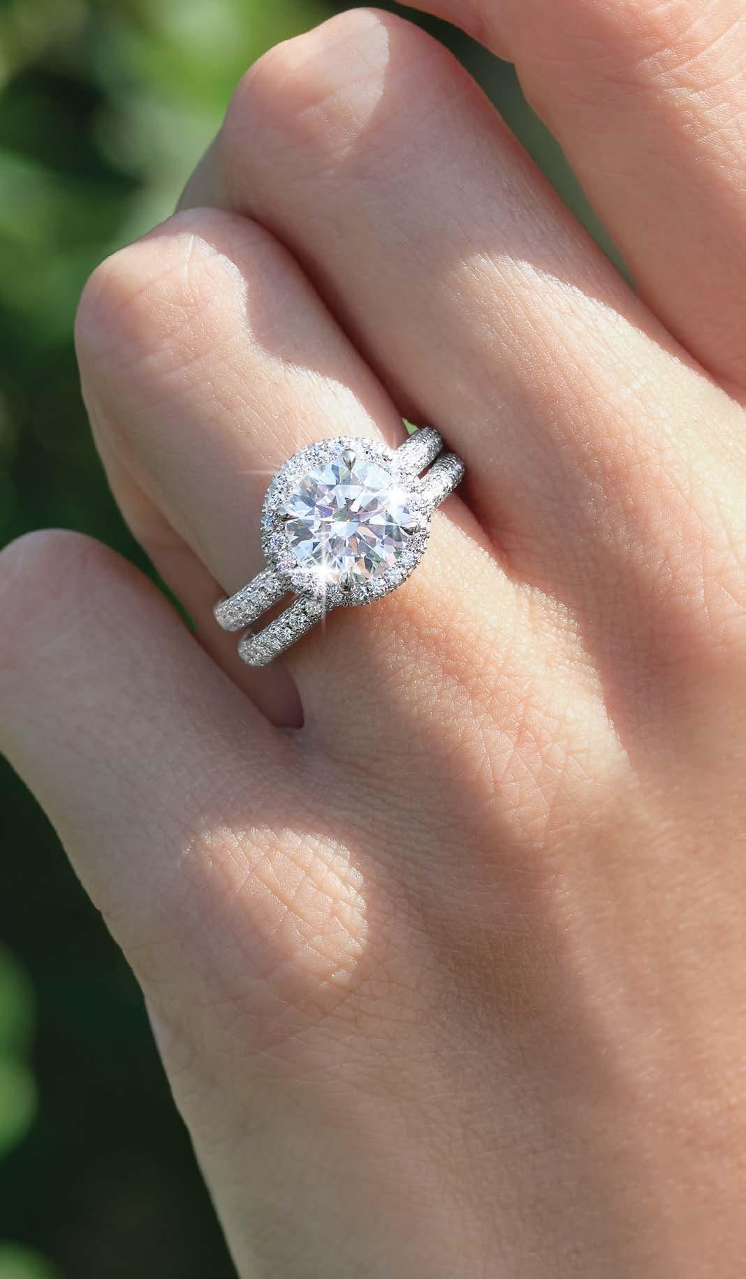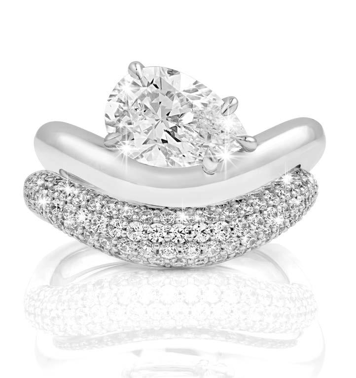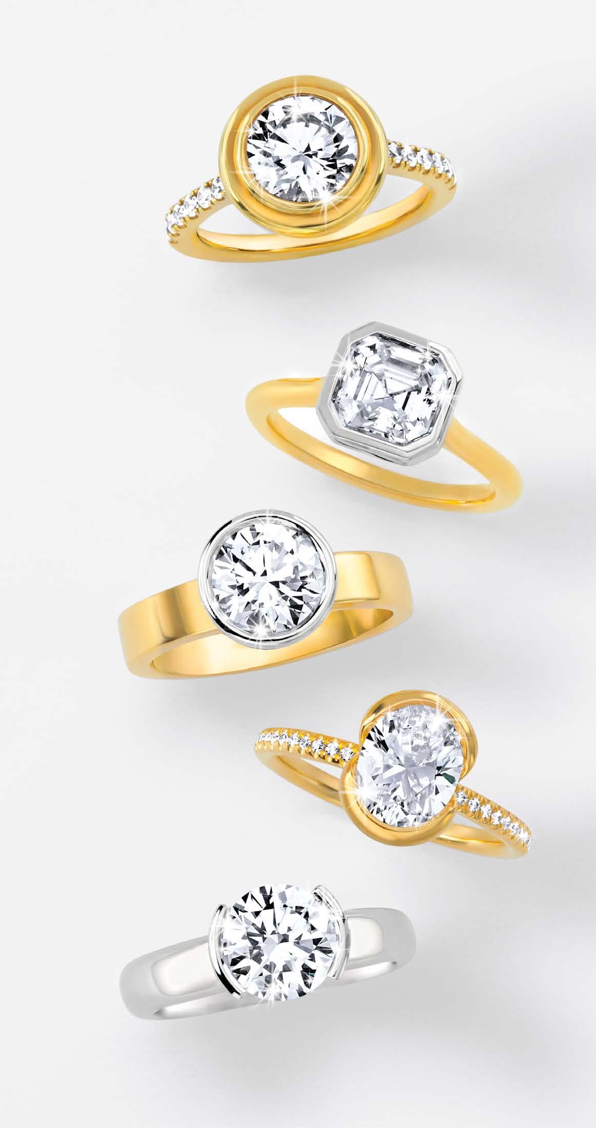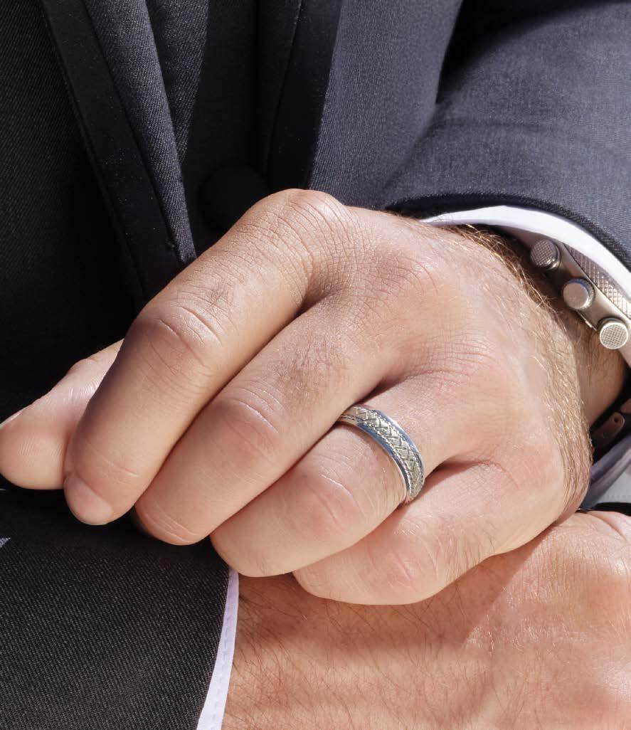 Lastly, the tried-and-true bezel setting. Favored by those who lean into contemporary design, bezelcrafted bands offer unmatched versatility. Whether refined or sculptural, minimal or fully embellished, this setting stands confidently on its own or blends seamlessly into a stack. It’s a statement style— subtle yet striking—worthy of wowing the bride. An engagement ring or wedding band is a symbol of enduring commitment.