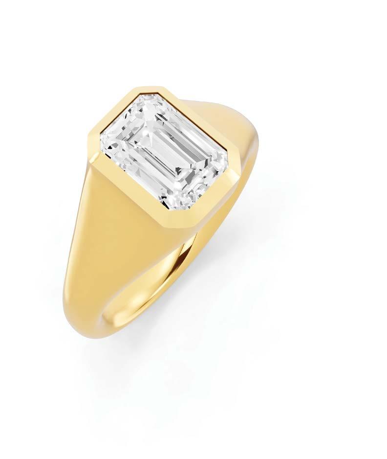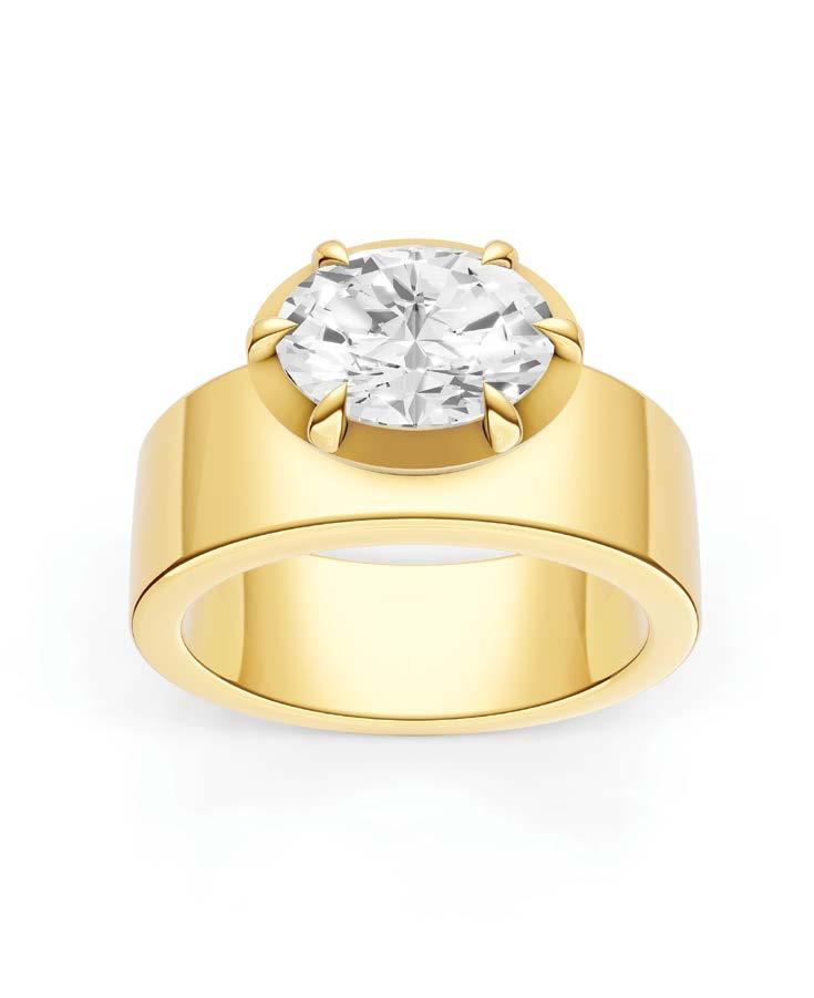 When it comes to geometric-style bands, there are no rules—no limitations to his or hers. These designs offer a playful yet sophisticated take on the traditional band, striking the perfect balance between sculptural metalwork and covetable design details. Then come the bold statement settings. This is the wide-band crowd—those drawn to heavier silhouettes and, ultimately, larger stones. Think cigar-ring proportions, often styled on the pinky to complement the look.