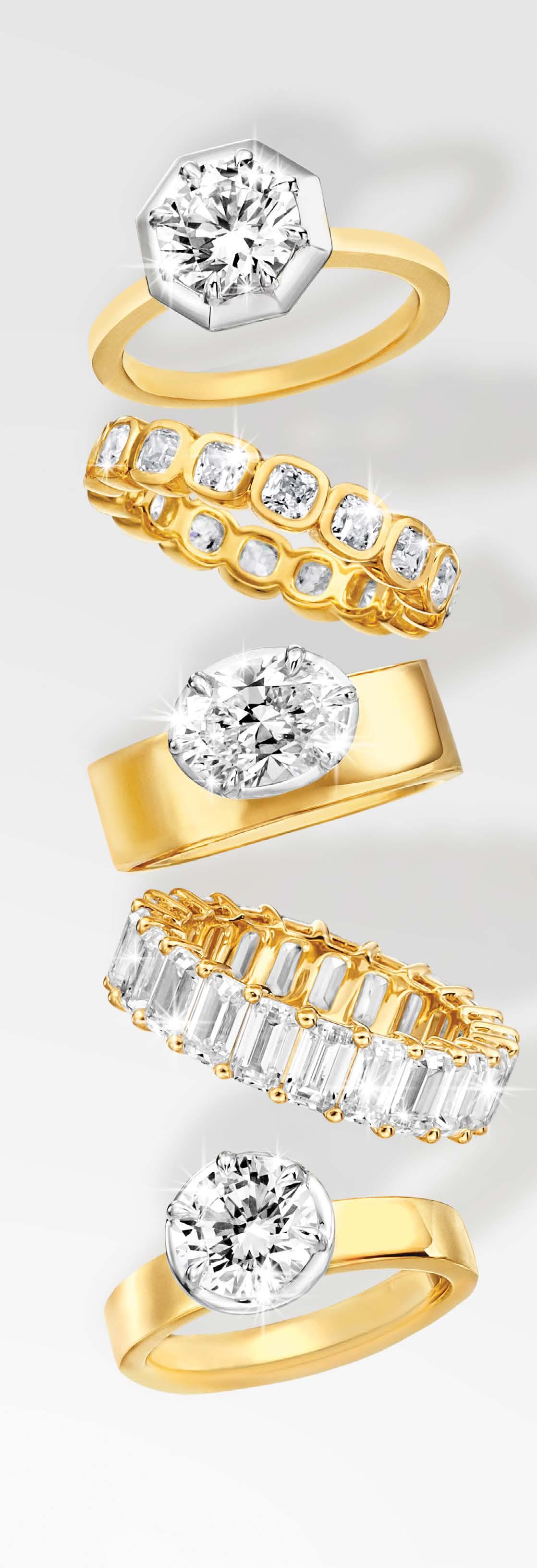 Above: E2W Oval Diamond Band MB000390 | Emerald-Cut Basket Set Diamond Band MB000177 | E2W Bezel Oval Diamond Band MB000584 Bezel Round Diamond Band MB000170 | Bar Baguette Diamond Band MB000352 | Bezel Alternating Pear Diamond Band MB000576 | ThreeRow Pave Band MB000176 | Bezel Asscher Diamond Band MB000578 | Bezel Round & Baguette Diamond Band MB000582 | Opposite Page: Petal Classic Ring MB000298 | Oval Diamond Band MB000389 | Toi et Moi Oval & Pear Ring MB000273 |