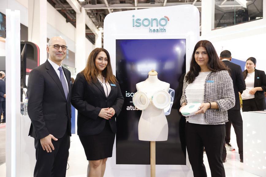 Akram Bouchenaki, CEO Abdul Latif Jameel Health, Maryam Ziaei and Shadi Saberi, co-founders iSono Health at Arab Health 2023.