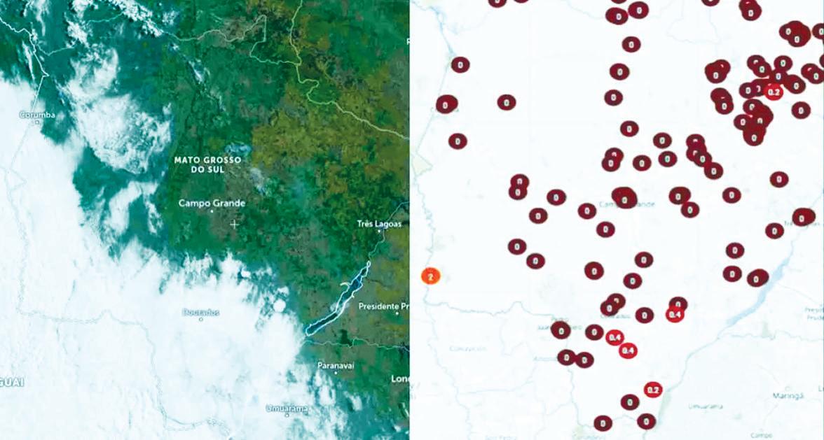 À esquerda, avanço da frente fria em MS; ao lado, indicação de falta de chuva