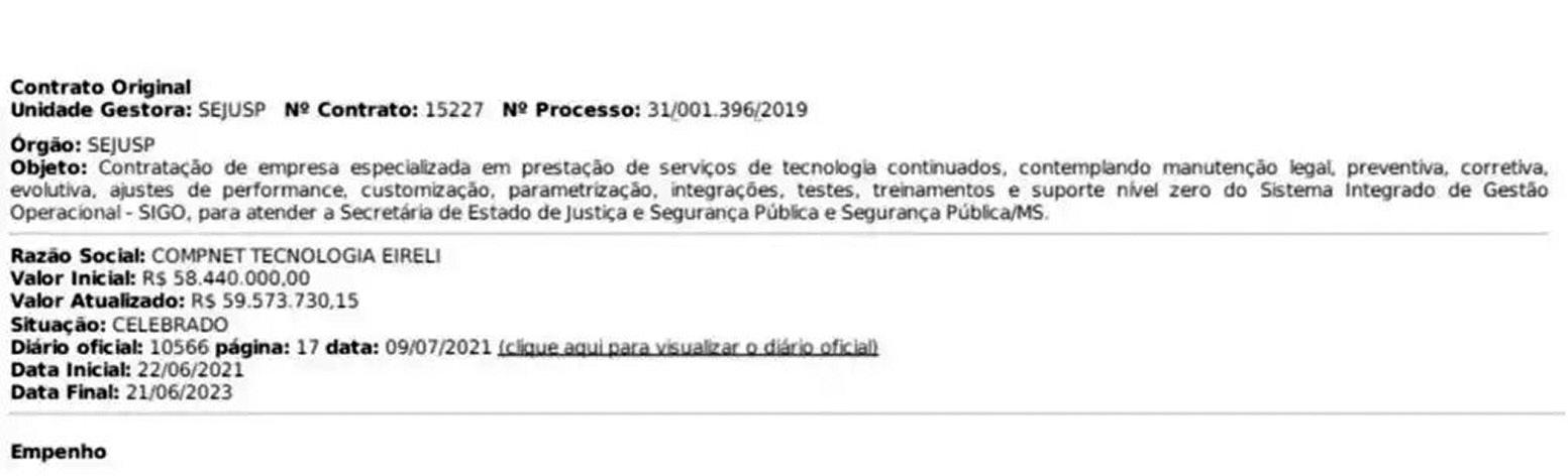 de Mato Grosso do Sul. Mensalmente, saem dos cofres públicos de Mato Grosso do Sul R$ 1.530.313,82 pelo contrato 32/2021/Sejusp, assinado em 22/06/2021, com valor inicial de R$ 58,4 milhões. De lá para cá, o contrato foi aditivado uma vez. O valor atual é de R$ 59,5 milhões.