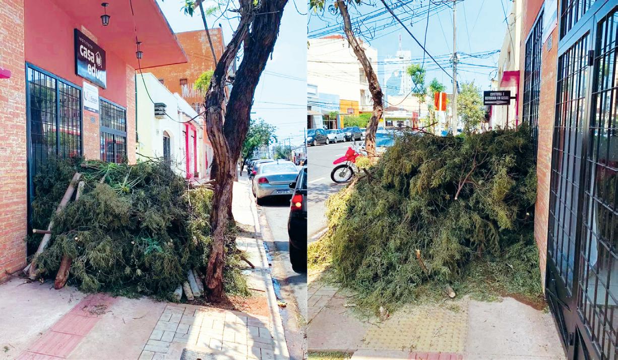 Proprietários de uma empre sa na Rua 7 de Setembro, no Centro, reclamaram de galhos deixados na calçada após poda feita pela Energisa, que atrapa lhavam a passagem de pedestres e o acesso ao estabelecimento.