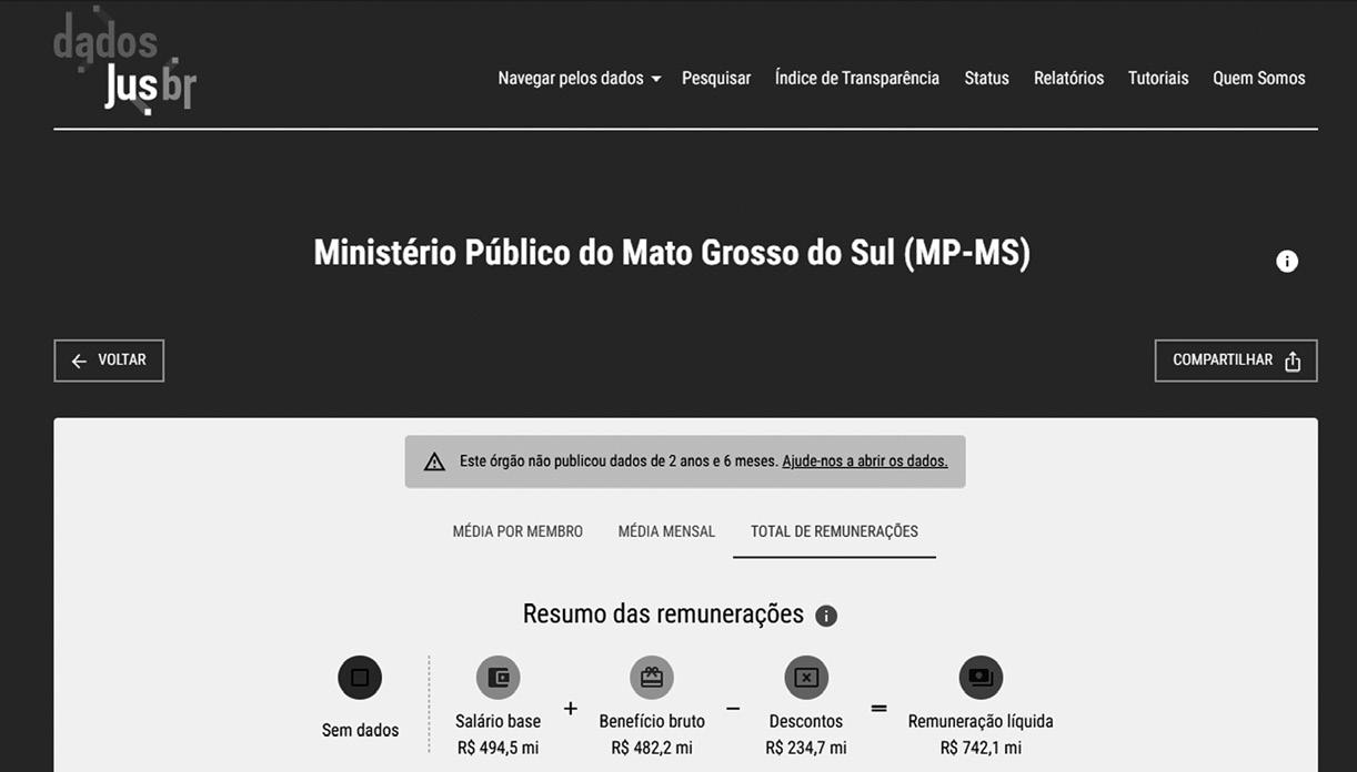 tudo, não existe um padrão. Projetos como o Dados JusBR visam a dar clareza aos registros de tais publicações. Como o MPMS não divulga dados suficientes para raspagem da plataforma pública, o Dados JusBR orienta aos cidadãos o registro de pedidos das informações. Assim, estes podem ser feitos por meio da Ouvidoria do MPMS. (DG)