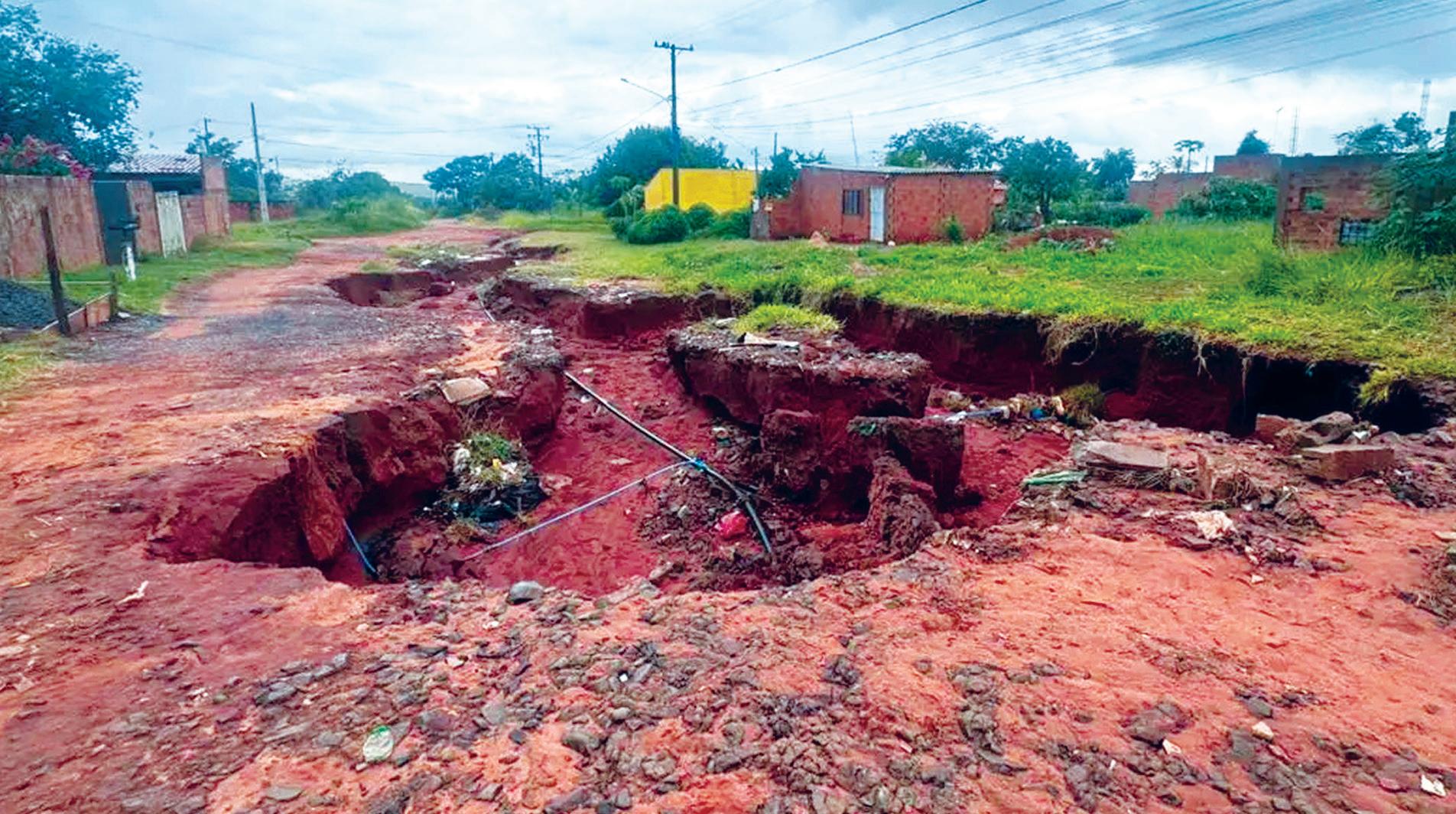 Na manhã desta segunda-feira (9), a chuva rápida que atingiu o Jardim Noroeste transformou a Rua da Conquista em uma cachoeira, na altura da Rua das Dálias. O problema piora a cada chuva, mas a via é intransitável desde o ano passado por conta de uma cratera, que se estende por três quadras e tem cerca de dois metros de profundidade.