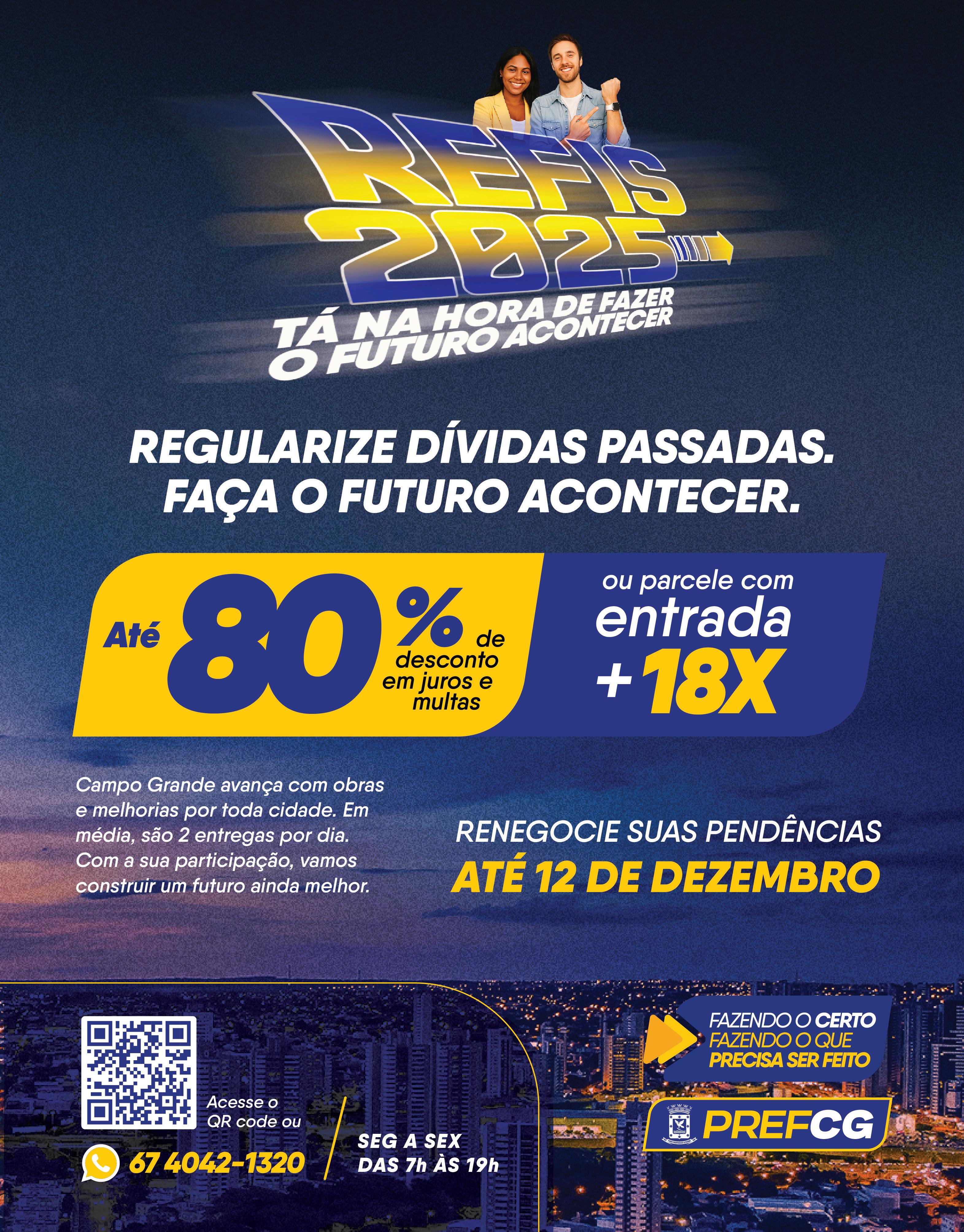 Esta sexta-feira (12) é o último dia do Refis 2025 para contribuintes que desejam renegociar débitos com a Prefeitura de Campo Grande, com possibilidades de descontos e parcelamentos. O programa oferece até 80% de abatimento em juros e multas para regularização de dívidas tributárias e não tributárias constituídas até 10 de novembro.