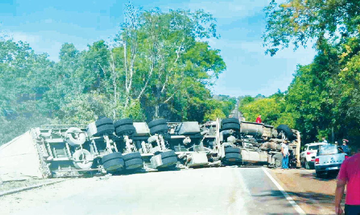 Carreta tomba entre Terenos e a região do ‘Redondo’ e trânsito na BR-262 fica interditado por cerca de oito horas