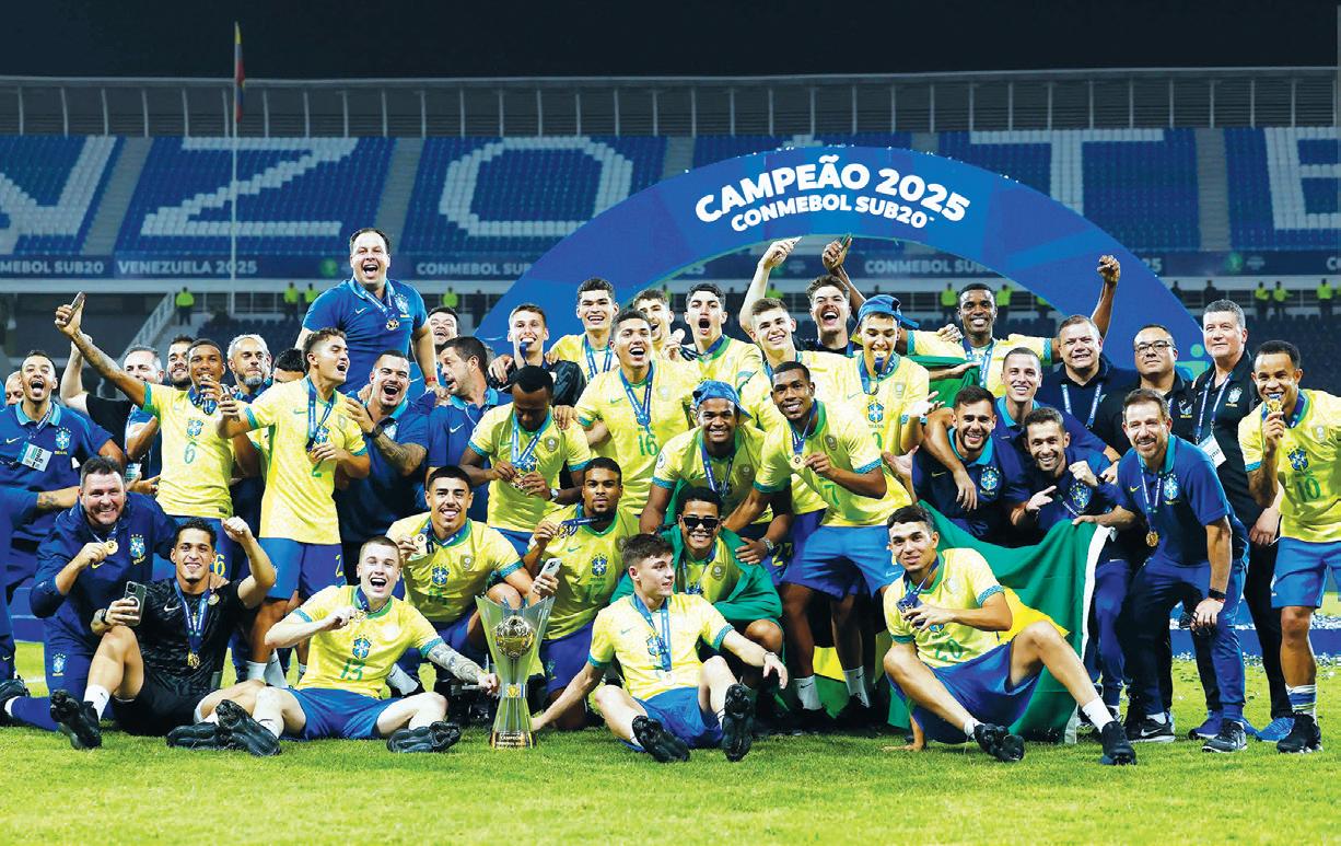 Com 3 horas de “atraso”, a seleção brasileira pôde soltar o grito de campeã do Sul-Americano Sub-20 pela 13.ª vez neste domingo (16). Maior vencedora da competição, a equipe já detinha o título e voltou ao topo do pódio após a rival Argentina não conseguir a goleada por 4 gols de diferença sobre o Paraguai no último jogo do hexagonal final. Depois de sair em desvantagem de 2 a 0, os hermanos até conseguiram reagir ao buscar um insuficiente 2 a 2, mas sofreram outro gol no fim e perderam por 3 a 2 sob gritos de “olé” dos brasileiros. O elenco do técnico Ramon Menezes estava na arquibancada do Estádio José Antonio Anzoátegui, em Puerto la Cruz, na Venezuela, para “secar” os hermanos após fazerem 3 a 0