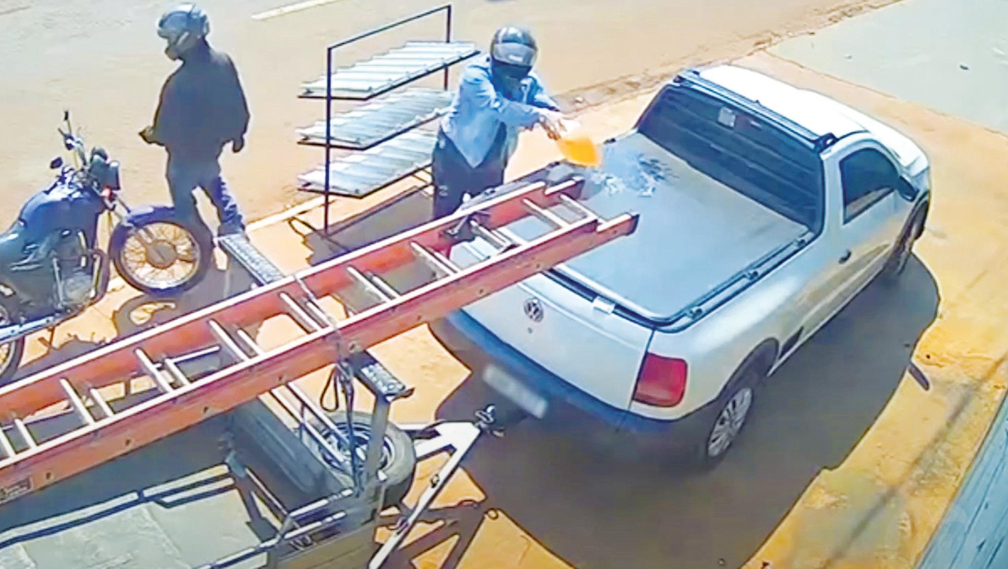 Nas imagens, é possível ver a Saveiro branca, que pertence a um empresário, estacionada na calçada. Dois homens, em uma motocicleta, tentam quebrar a janela do motorista, mas não conseguem.
