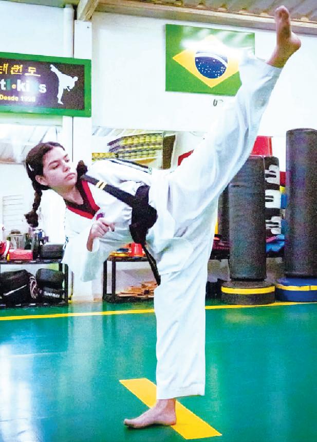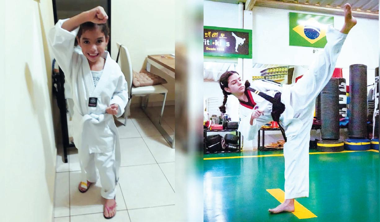 Lavínia ao iniciar no taekwondo e aos 15 anos, quando chegou à faixa preta