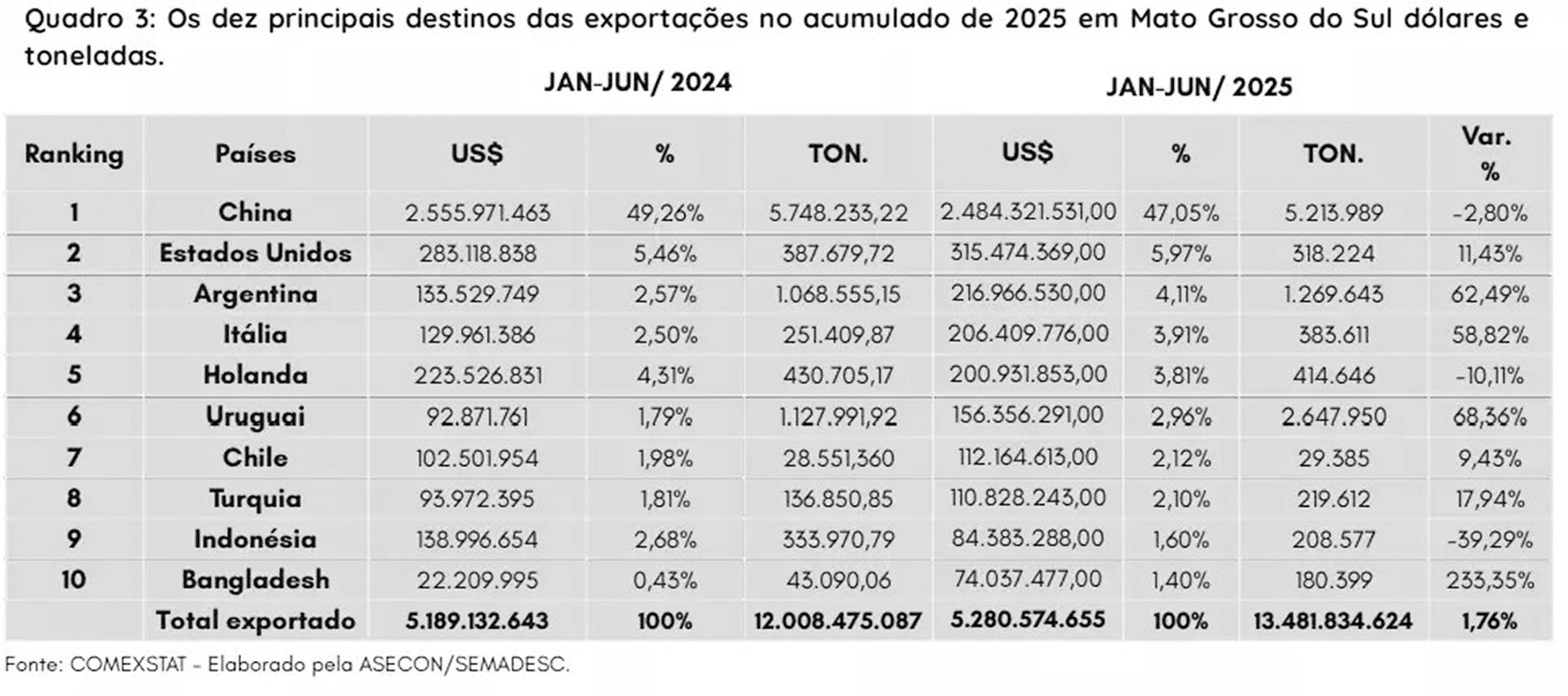 Os Estados Unidos representa apenas 5,97% das exportações de produtos sul-mato-grossenses, conforme aponta o relatório Comex de junho de 2025, elaborado pela Semadesc (Secretaria de Estado de Meio Ambiente, Desenvolvimento, Ciência, Tecnologia e Inovação de Mato Grosso do Sul).