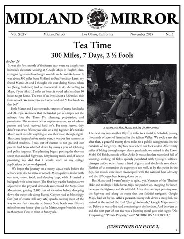 Aftermuchdiscussion,wedecidedtofindanalternateroute,and headedbackthroughthestinkingoilfield Butafterthirty-fivemiles ofbikingthatday,theafternoonheatandtherapidlyapproaching sunset forced us to stop and call our support driver (my dad) for help Defeated,wehitchedaridetohishotelinPasoRobles,where weateChipotle,satinthehottub,andplayedBrawlStars Trulya devastatingdefeat,andtwentymilestragicallymissed Onthefifthday,wehadplannedtostayatourfriendShae‘26’s house in Baywood-Los Osos, forty miles from Paso Robles We textedherthemorningoftoremindherthatwewerecoming,and thenathoughtoccurred:itwasonlytwodaysleft Surely,shedidn’t haveanythingimportantlefttodofortherestofthesummer?“I rememberIwasjustmindingmyownbusinesswatchingTVwhen Mateo texted saying that he would be there in a few hours,” she recalled “Iinitiallythoughttheywerejoking Butmyparentslooked at me dead serious, and said ‘ you should go. ’” After crossing the Santa Lucia mountains and escaping the beating heat of inner California,wecoastedalongthecoasttoherhouseandpickedup thethirdmusketeerofourtrip.