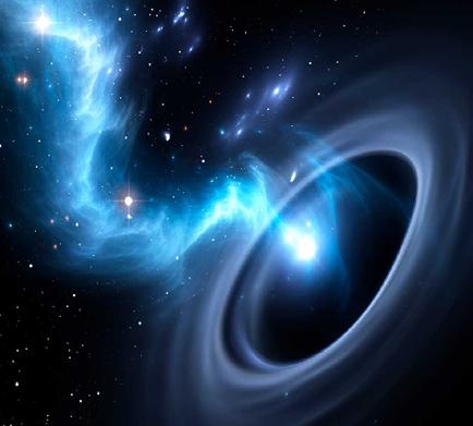 En la figura debajo se puede obsevar la forma que toma en el espacio un agujero negro según los estudios científicos que nos brindan esta figuración que se conoce a través de los efectos del mismo.