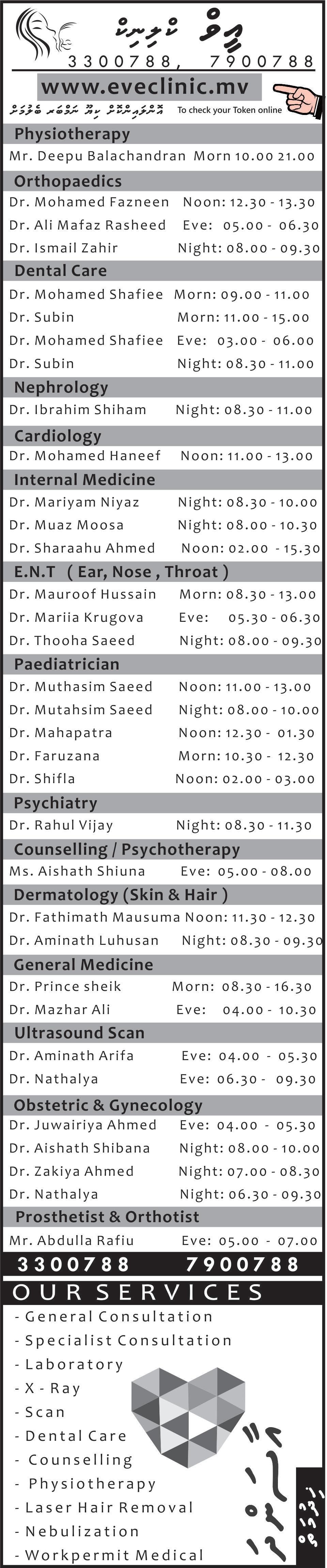 ުކެއިއާޓްނަމްޓްނިއޮޕެއ Dr. Niuma 20:00 Dr. Reema 19:30 Dr. Rukhsana ުކެއިއާޓްނަމްޓްނިއޮޕެއ Dr. Shaheedha 18:15 Dr.