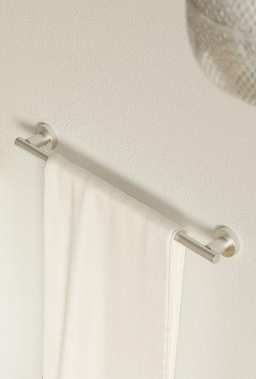 Cosmic in brushed nickel with itswarm hue, will add a touch of timeless appeal to your bathroom.
