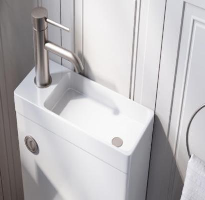 The Space close coupled style combination toilet and basin unit offers an innovative 2-in-1 design, perfect for maximising space in compact bathrooms or cloakrooms and ideal if you need to save on room by minimising the area taken up by a separate basin. The integrated basin, positioned conveniently on top of the cistern, allows for watersaving and eco-friendly efficiency by enabling reused water from hand washing to flush the toilet.