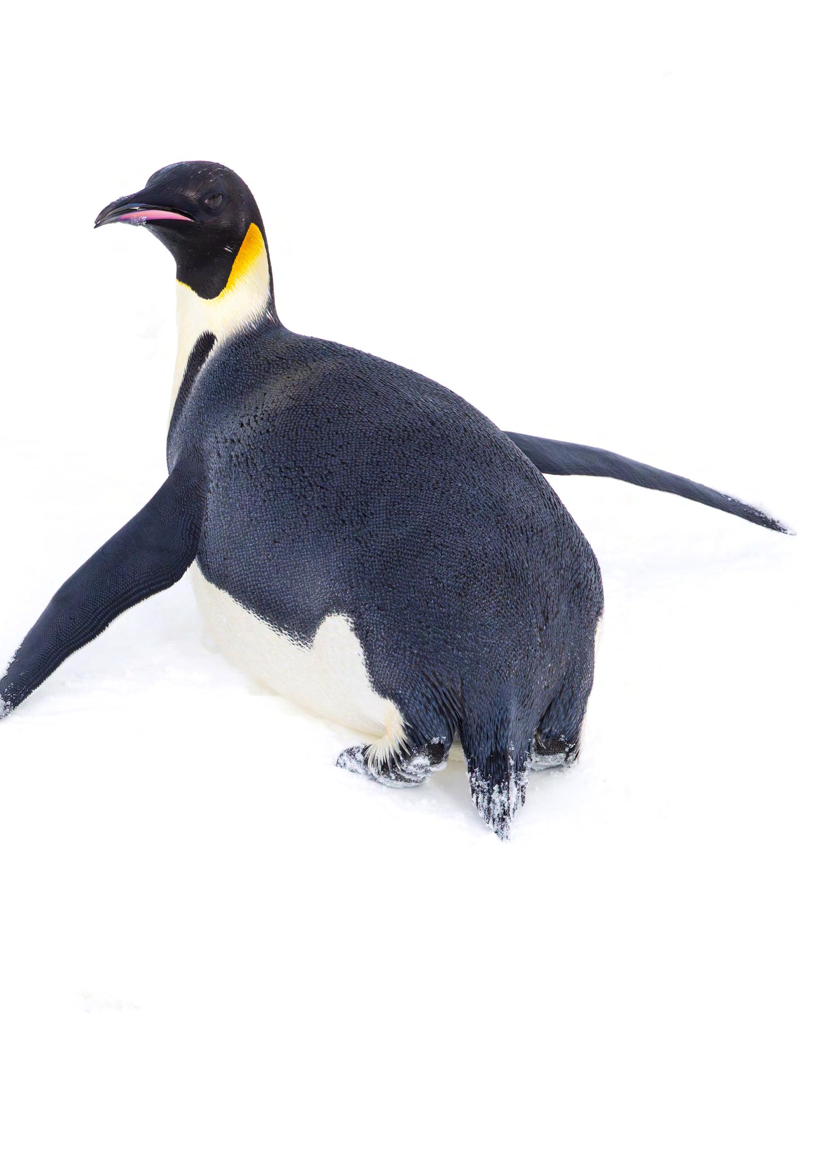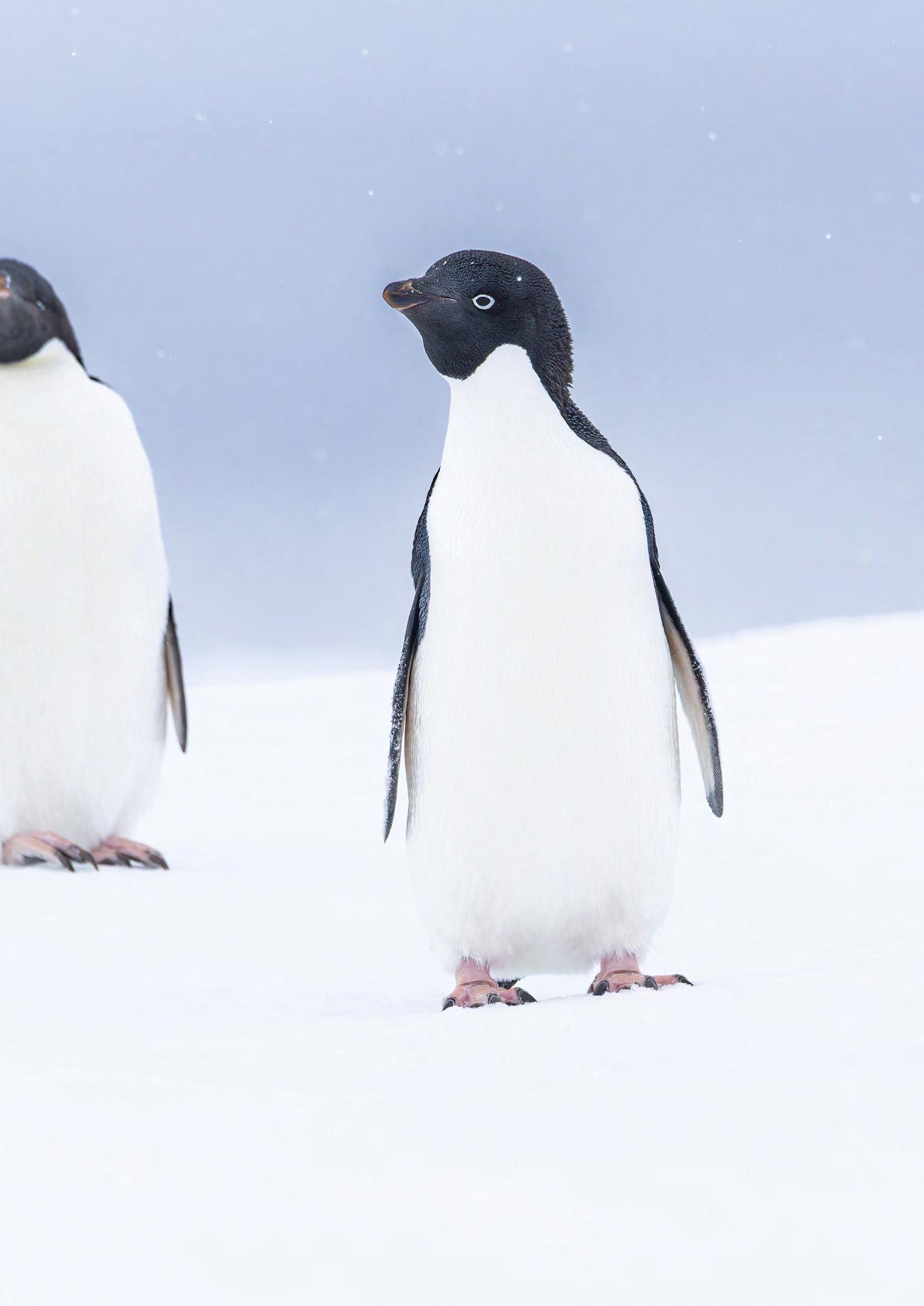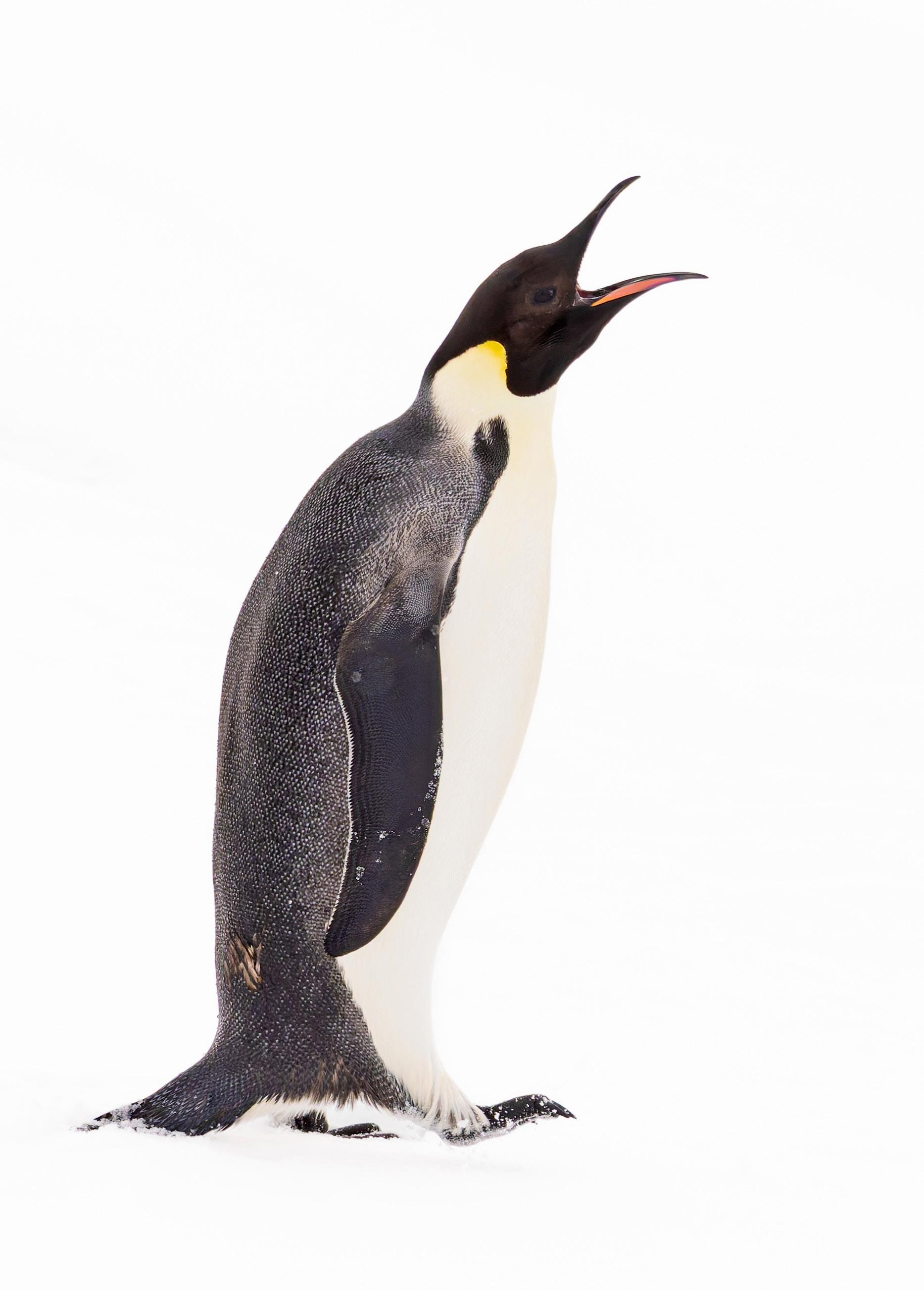 Emperor Penguin, Fridtjof Sound. Previous page: tabular icebergs Antarctic Sound. Next pages: Adelie Penguins (Mike Watson)