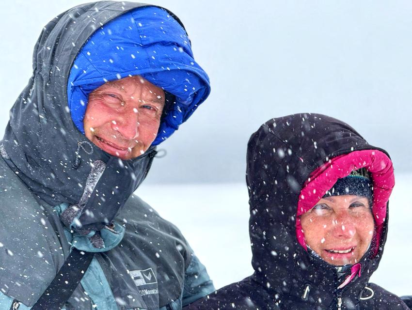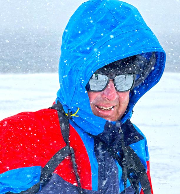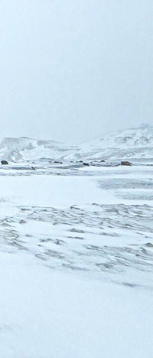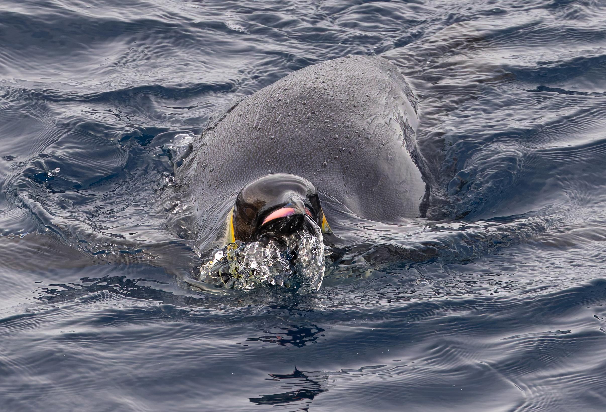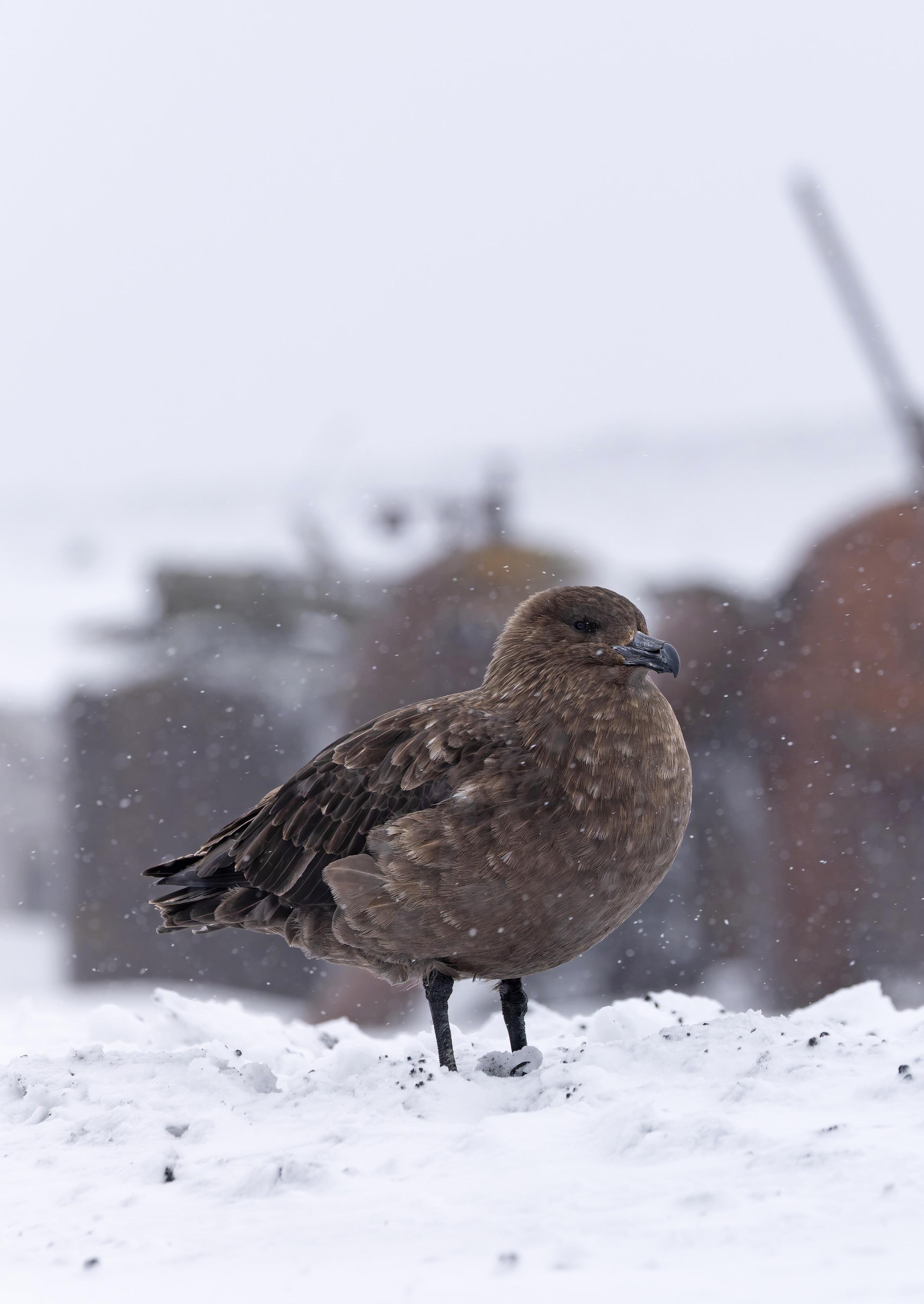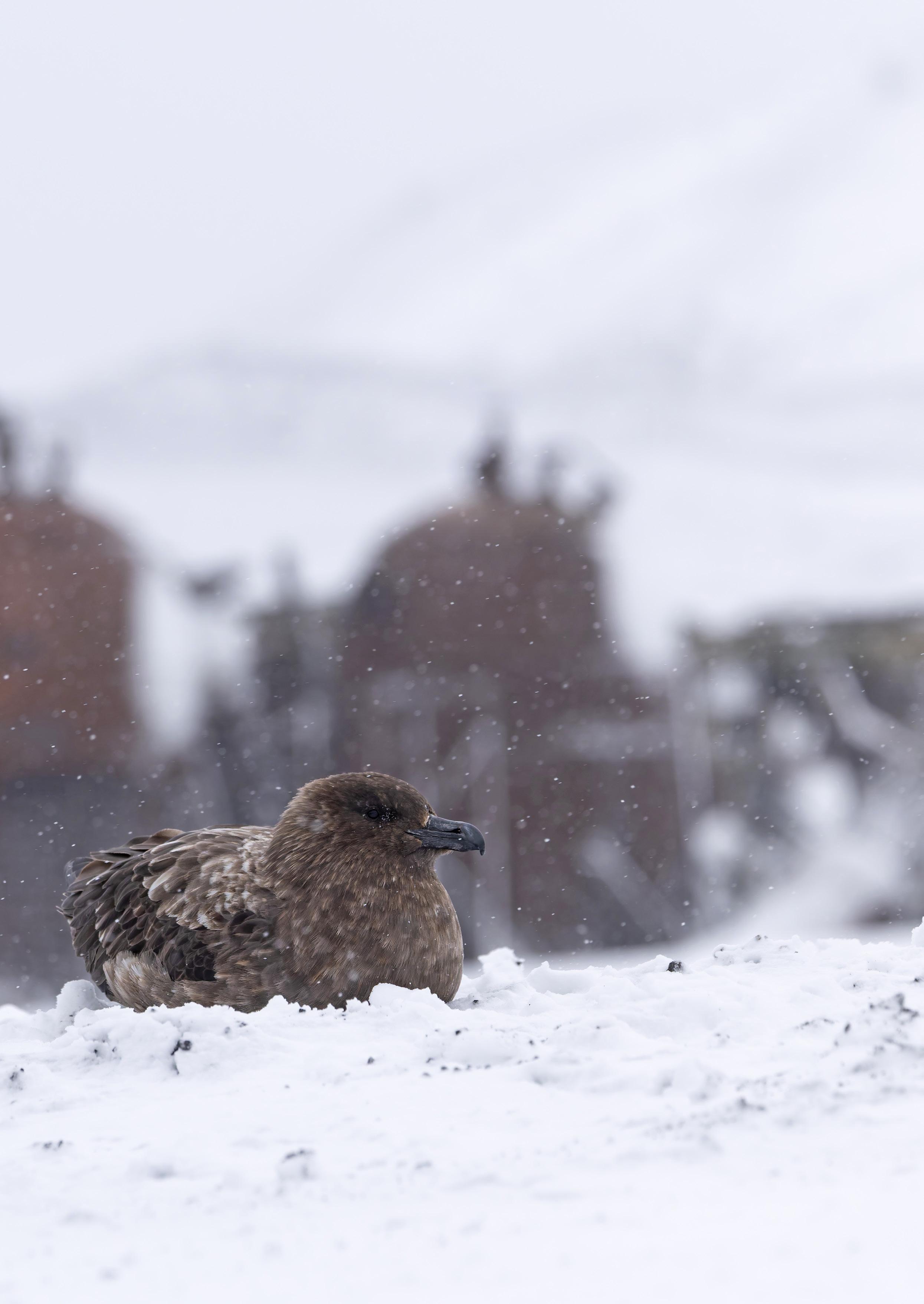 ashore, it was still snowing and blowing a gale, but this was our first chance to set foot on Antarctica, albeit not the continental mainland. A greeting party of Gentoo Penguins was on the beach, and an intrepid pair of Kelp Gulls was nesting nearby on an old whaling boiler. The 15km wide island is in the Bransfield Strait and has a safe natural harbour, accessed via the 500m wide narrows. First discovered by Smith and Bransfield in 1820, it was sealer Nathaniel Palmer who found the inner basin the following year and named it Deception Island. A small seal hunting operation lasted a few years after which the island was quiet for another 80 years when a whaling operation began, as an extension to activities on South Georgia. In 1908 the island was declared part of the Falkland Islands Dependencies by the British Government. We explored some of the derelict buildings, including Biscoe House, which was the British scientific base, destroyed by mudflows from the 1969 volcanic eruption. (We had to check seismic activity before our landing this time! 55 years is the blink of an eye in geological time!). We returned to the landing spot to find a pair of brutish Brown Skuas had appeared from further along the beach and a small party of Antarctic Terns flew over. Towards the end of our landing a Chinstrap Penguin came ashore for some, and there were a few seen on the beach on our way out, only a fraction of the 200,000 Chinstraps breeding on the eastern tip of the island at Baily Head! A few of the crazier guests on board took a polar plunge at Whaler’s Bay, some of them were coughing for days afterwards, so be warned. Cruising south this evening, the sea was calm and the wind had dropped. Fin Whales were spotted, the Bransfield Strait is a good spot for them!