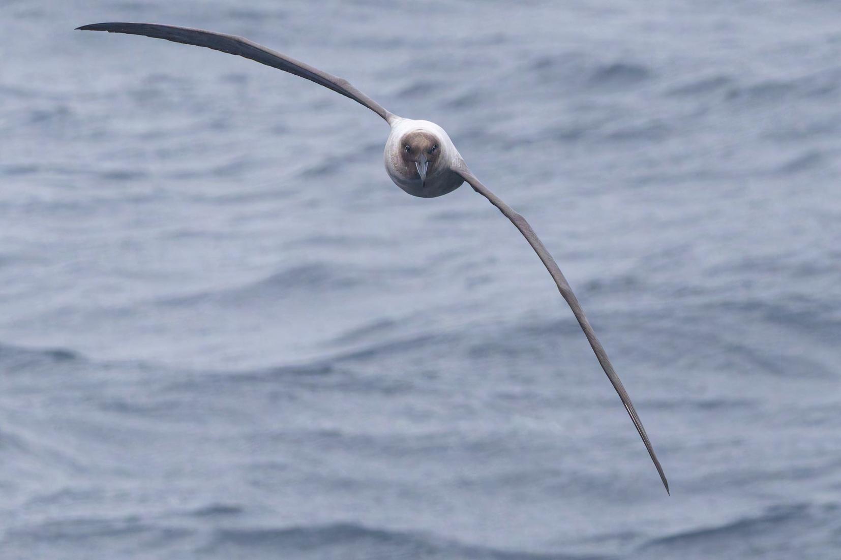 the waves, their wings bowed and disappearing into the shallow troughs seeking every little push of uplift. There was at least another one million briefings today, interrupting seabirding but an enforced rest is not a bad idea, it is tough work to concentrate hard on deck all day! We added White-chinned Petrel and both Antarctic and Slender-billed Prions. As we ventured further south towards the Antarctic Convergence (the meeting of the warmer Atlantic and cold Antarctic waters) at roughly 60 degrees it grew misty. Brown Skua and Hourglass Dolphin were late additions before our watch ended. However, the day had belonged to the magnificent Light-mantled (Sooty) Albatrosses, of which we had logged almost 30, including some strikingly pale-bodied first year birds. I didn’t see any birds of this age last time I crossed the Drake. They were almost ever present, a real privilege to spend so much time with them, made even more spectacular by their propensity to whizz by the boat’s superstructure at very close range. Thrilling stuff! The swell had increased to around 3m by the end of the day as we rolled south along the waves with a tailwind roughly at the convergence at 60.1 degrees south.