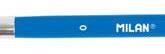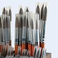 Pincel redondo con punta fina. Mango azul brillante corto de madera barnizada y con el extremo plateado mate. Virola de latón niquelado.