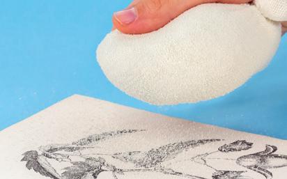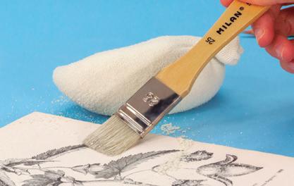 Presser et secouer doucement le coussin nettoyeur jusqu’à ce que la poussière de gomme apparaisse. Former une fine couche sur la zone à nettoyer. Étaler la poussière avec un pinceau souple en réalisant des mouvements circulaires. Enlever la poussière de gomme de la surface nettoyée.