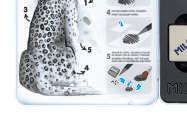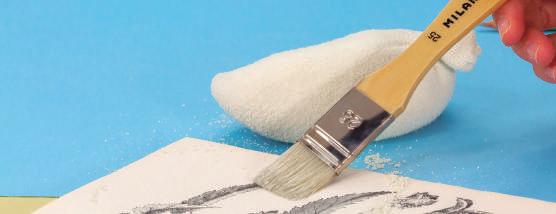 e agitar suavemente a almofada de limpeza até aparecer o pó de borracha. Formar uma camada fina sobre a área a limpar. Espalhar o pó com um pincel suave, fazendo movimentos circulares. Retirar o pó de borracha da superfície de limpeza.