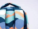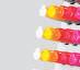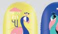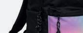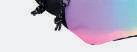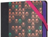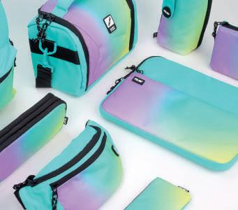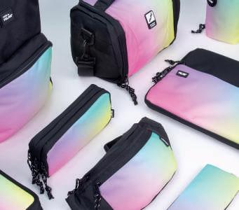 Uma combinação de cores gradientes inspiradas no pôr-do-sol acompanhadas de estampagens geométricas a preto e branco.