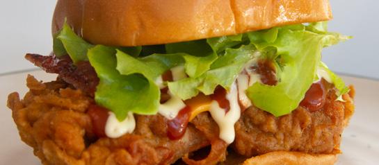 Fried chicken breast, with bacon, lettuce, tomatoes accompanied with seasoned crispy French fries.