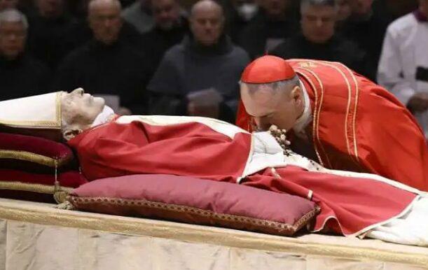 que representan la sangre mártir. La capilla ardiente provocó una larga fila de personas que daba la vuelta a la plaza de San Pedro y que desfiló ante los restos del papa alemán, escoltados por dos Guardias Suizos con alabardas. Muchos eran fieles que inclinaban su cabeza ante el pontífice o se hacían la señal de la Cruz mientras que otros tantos eran turistas o personas a los que este fallecimiento vaticano ha pillado en Roma. En el lugar estaba también la “familia vaticana” de Ratzinger, las personas que le asistieron en su retiro en el monasterio Mater Ecclesiae del Vaticano, entre estos su secretario personal, Georg Gänswein, que recibió el pésame de algunos de los fieles. Velando el cadáver se pudo ver a algunas monjas y antiguos miembros de la curia, como el cardenal y arzobispo emérito de Valencia, Antonio Cañizares, con un bastón, o los también purpurados Camillo Ruini, en silla de ruedas, y el alemán Walter Kasper. M