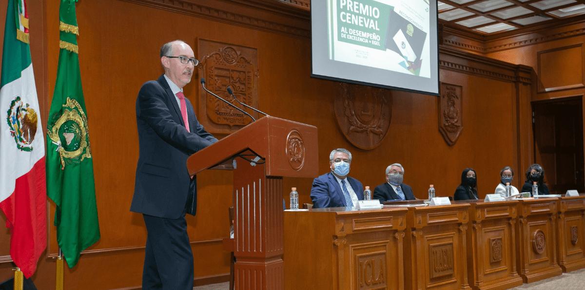 CENEVAL, Antonio Ávila Díaz, destacó que este premio se entrega al alumnado que alcanza los niveles de desempeño sobresalientes en la sección disciplinar del EGEL Plus y en la nueva sección transversal de lenguaje y comunicación. Destacó que solo 2 mil 310 estudiantes de los 15 mil evaluados alcanzaron un puntaje de excelencia académica, por lo que el premio representa un mérito para los y las universitarios. En representación de los 61 egresados que obtuvieron esta distinción, Karla Lizeth Esquivel Mondragón enfatizó que haber obtenido el premio es resultado de la dedicación, constancia, perseverancia y disciplina que mantuvieron durante años de estudio y ofrece certeza de que los conocimientos obtenidos en las aulas son los necesarios para servir a la sociedad y al sector productivo. M