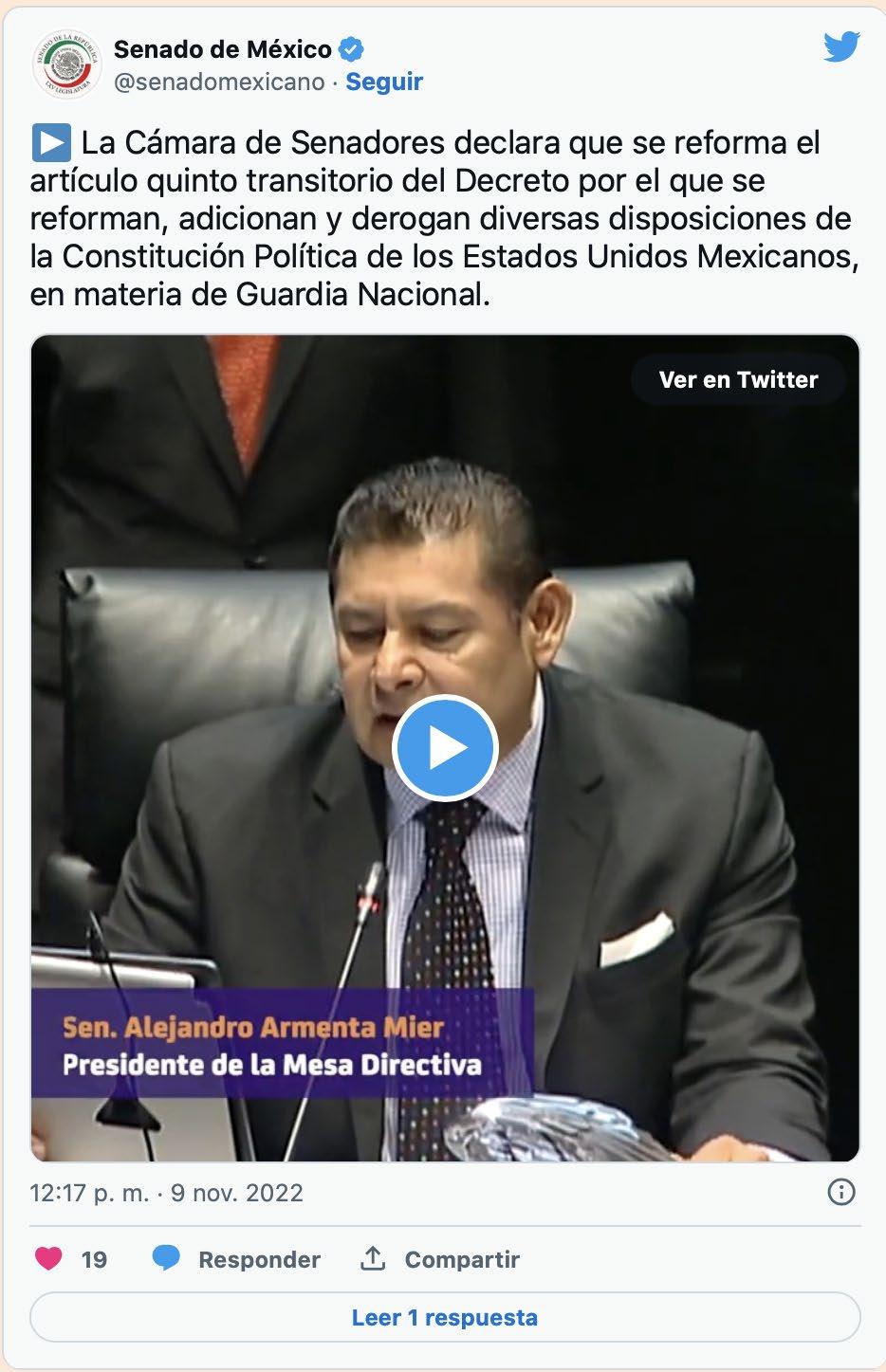 “La Cámara de Senadores declara se reforma el artículo Quinto Transitorio del decreto por el que se reforman, adicionan y derogan diversas disposiciones de la Constitución Política de los Estados Unidos Mexicanos en materia de Guardia Nacional”, dijo durante la sesión ordinaria de este miércoles el presidente del Senado, Alejandro Armenta Mier.