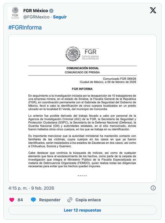 La Fiscalía General de la República (FGR), confirmó que se llevó a cabo la identificación de cinco cuerpos localizados en un predio ubicado en la localidad El Verde, en el municipio de Concordia, Sinaloa. Lo anterior, en seguimiento a la investigación iniciada por la desaparición de 10 trabajadores de la empresa minera canadiense Vizsla Silver Corp, en el estado de Sinaloa. La FGR señaló que los trabajos se han realizado en coordinación permanente con los integrantes del “Gabinete de Seguridad” del Gobierno de México, derivado del