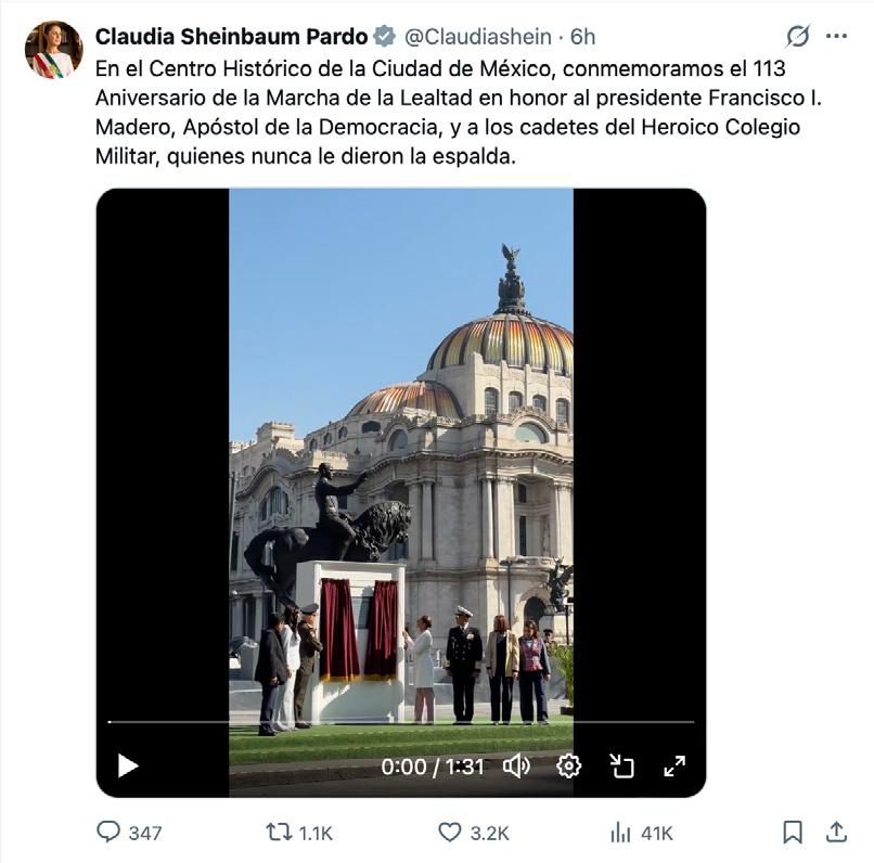 La presidenta Claudia Sheinbaum encabezó este 9 de febrero la ceremonia por el 113 aniversario de la Marcha de la Lealtad en el Zócalo de la Ciudad de México, acompañada por altos mandos de las Fuerzas Armadas y autoridades de los poderes Legislativo y Judicial. En la ceremonia, la presidenta realizó el pase de lista de honor de los héroes de las gestas históricas del Heroico Colegio Militar. La escoltaban el secretario de la Defensa Nacional, general Ricardo Trevilla Trejo, así como las presidentas de las mesas directivas del Senado y la Cámara de Diputados, y el ministro presidente de la Suprema Corte de Justicia de la Nación, entre otros integrantes del gabinete. Cadetes y compañías militares participaron en los homenajes. Durante el acto, Sheinbaum develó una placa conmemorativa en la lateral del Palacio de Bellas Artes a la memoria del teniente alumno Gerardo Ríos Covarrubias. Gerardo Ríos Covarrubias, murió durante el trayecto de la marcha del Castillo de Chapultepec al Palacio Nacional el 9 de febrero de 1913. De acuerdo con el Gobierno de México, este gesto subrayó la entrega y la “congruencia de lealtad” característica de las y los cadetes del Heroico Colegio Militar.