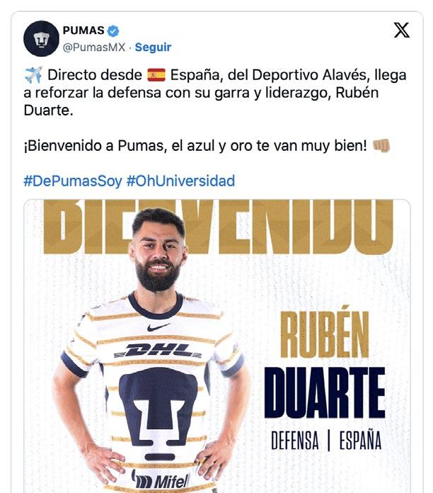 garra y liderazgo, Rubén Duarte. ¡Bienvenido a Pumas, el azul y oro te van muy bien!”, escribió el club.