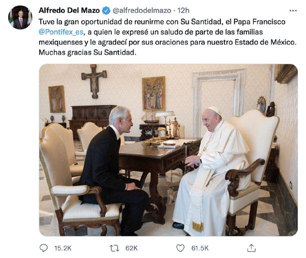 escribió el mandatario estatal en sus redes sociales. De acuerdo con esta información, el Santo Padre saludó a la familia, y tras un intercambio de regalos se reunió en privado con el goberna dor mexiquense.