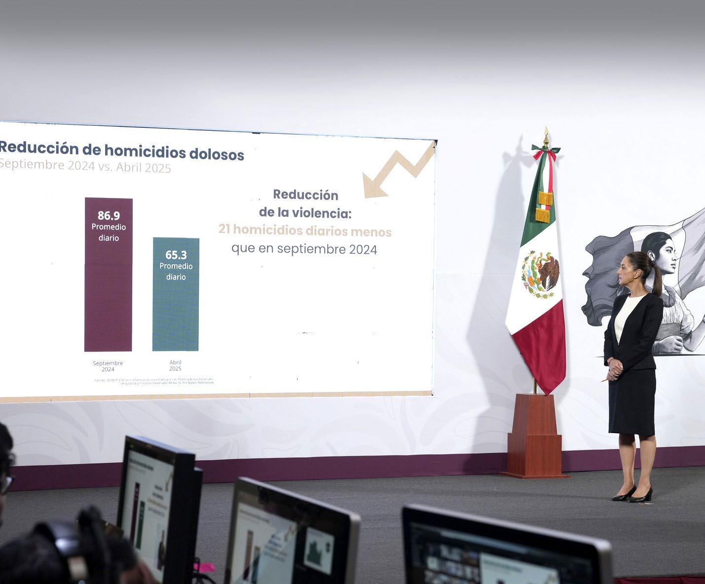 A siete meses del inicio de la administración de la Presidenta Claudia Sheinbaum, la reducción de cerca de 25 por ciento se debe a que en septiembre 2024 se registraron 86.9 homicidios y en abril 2025 65.3