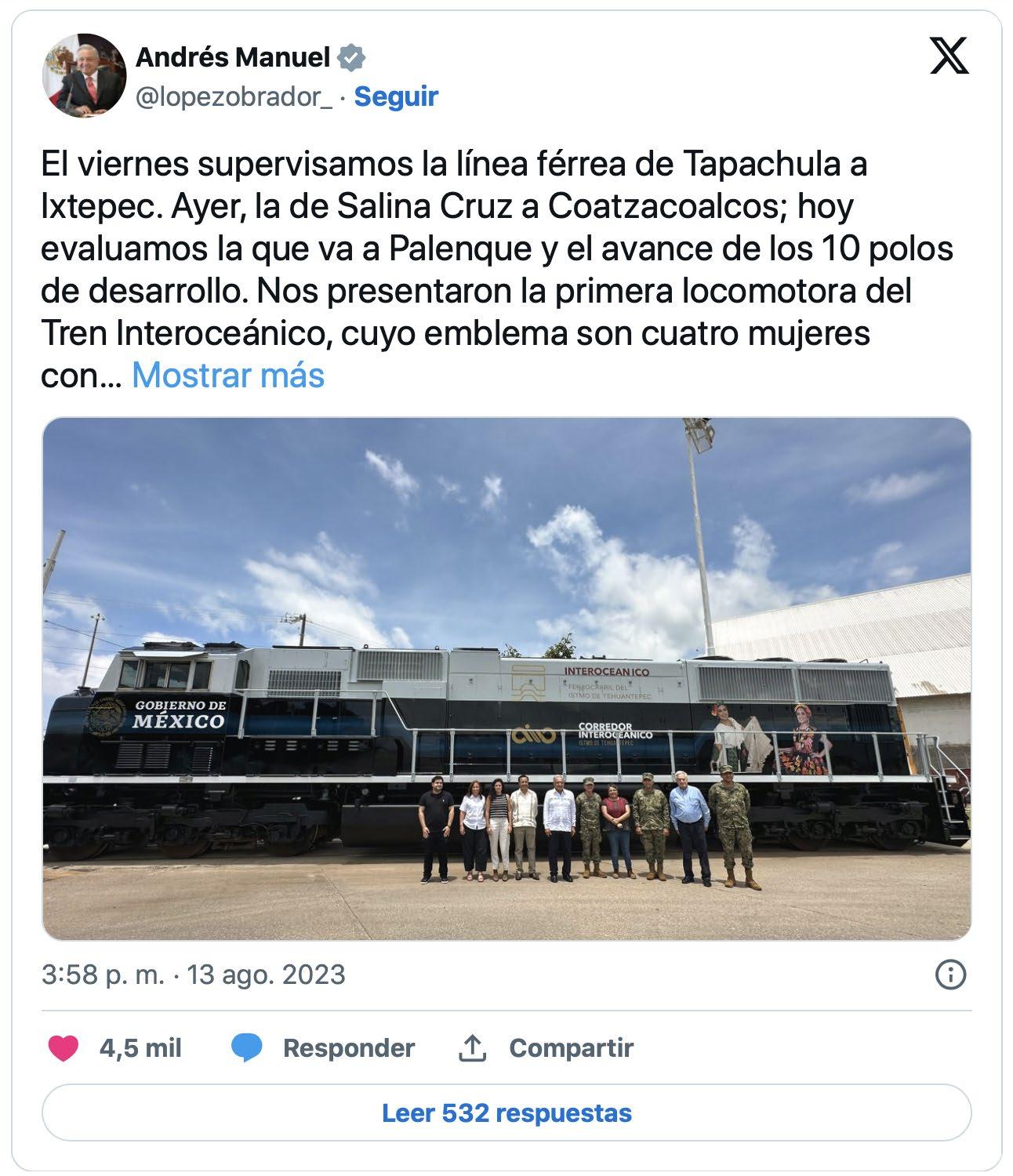 El presidente Andrés Manuel López Obrador concluyó este domingo un recorrido por las obras del Tren Interoceánico y anunció que ya le presentaron la que será la primera locomotora de este proyecto. El viernes supervisamos la línea férrea de Tapachula a Ixtepec. Ayer, la de Salina Cruz a Coatzacoalcos; hoy evaluamos la que va a Palenque y el avance de los 10 polos de desarrollo. Nos presentaron la primera locomotora del Tren Interoceánico, cuyo emblema son cuatro mujeres con trajes regionales de Oaxaca, Veracruz, Chiapas y Tabasco”, escribió el mandatario en un mensaje de la red social X, antes Twitter. La Presidencia de la República informó que el mandatario concluyó en Veracruz el trabajo de supervisión al proyecto del Corredor Interoceánico del Istmo de Tehuantepec. El recorrido concluyó con la presentación de los avances de los diez polos de desarrollo de este proyecto, así como de la vía férrea con destino a la ciudad de Palenque, Chiapas. La supervisión comenzó el viernes pasado, con un recorrido en el tramo Tapachula a Ixtepec y el sábado fue en el tramo de Salina Cruz a Coatzacoalcos, se detalló. En esta gira de trabajo, el presidente López Obrador estuvo acompañado por el gobernador de Veracruz, Cuitláhuac García Jiménez; las secretarias de Gobernación, Luisa María Alcalde Luján; de Energía, Rocío Nahle García y de Economía, Raquel Buenrostro Sánchez. También lo acompañaron los secretarios de Marina, José Rafael Ojeda Durán y de Infraestructura, Comunicaciones y Transportes, Jorge Nuño Lara. Acudieron también los directores generales de la Comisión Federal de Electricidad (CFE), Manuel Bartlett Díaz; de Petróleos Mexicanos (Pemex), Octavio Romero Oropeza; y del Corredor Interoceánico del Istmo de Tehuantepec, Raymundo Pedro Morales Ángeles, entre otros. Rocío Nahle precisó que el Presidente encabezó este domingo en Coatzacoalcos una reunión de evaluación y seguimiento del proyecto Corredor Interoceánico del Istmo de Tehuantepec.