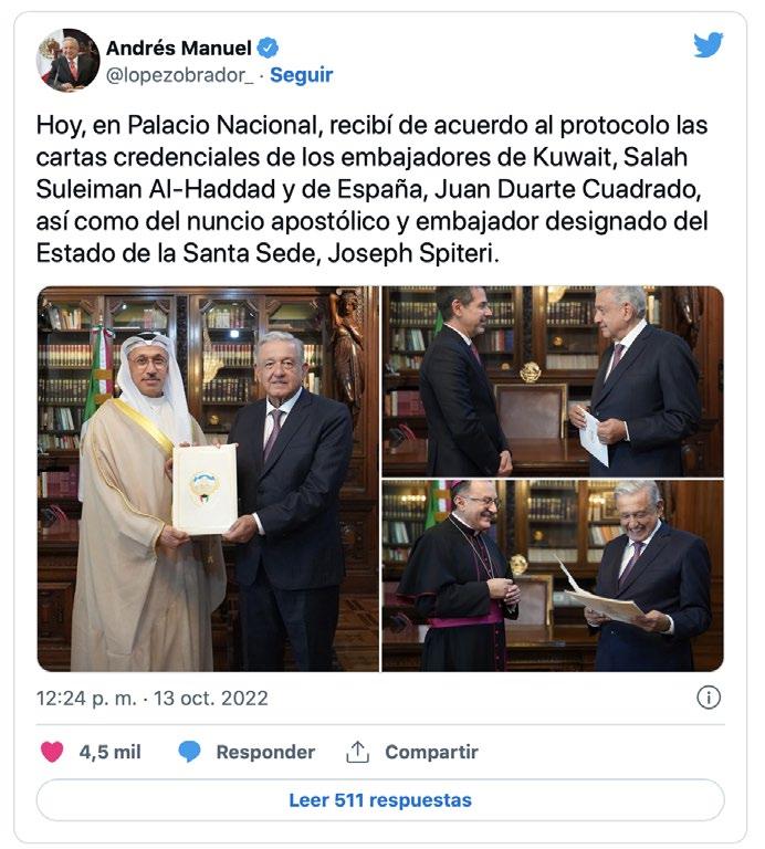 El presidente Andrés Manuel López Obrador recibió las cartas credenciales de los embajadores de España, Juan Duarte; así como del nuncio apostó lico, Joseph Spiteri. A través de sus redes sociales, López Obrador informó que también dio la bienvenida al embajador de Kuwait, Salah Suleiman Al-Haddad.