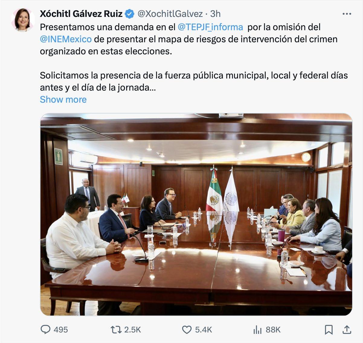 “El presidente ha afectado enormemente mi candidatura con dichos que son falsos. Primero diciendo que yo iba a quitar los programas sociales, lo que es falso. Luego aduciendo problemas de corrupción que nunca han existido y en todo eso el presidente incide, se mete en la elección a favor de su candidata abiertamente. Y nosotros lo que hemos dicho a los magistrados es no hay piso parejo”, comentó. En la reunión con los magistrados, encabezados por la presidenta Mónica Aralí Soto Fregoso, de la Coalición Fuerza y Corazón por México, solicitó a magistrados electorales que se ordene al INE la atracción de la operación y custodia de papelería electoral, antes y después de las elecciones, en las secciones identificadas como “foco rojo”, por riesgo de violencia el día de los comicios. La coalición impugnó ante el Tribunal la omisión del Instituto a la sentencia por la que se ordenó que presentara un protocolo de guía y actuación de autoridades para salvaguardar la integridad física de servidores públicos, electores y candidatos en zonas de alto riesgo por la presencia del crimen organizado. Asimismo ha sido omiso –aseguraron los opositores- en garantizar condiciones para la elección en zonas identificadas como “foco rojo” por riesgo de violencia. El coordinador de la campaña de Gálvez, Santiago Creel, explicó que fue por esa omisión del INE que la coalición presentó su mapa de riesgos. En la reunión, se pidió a los magistrados que se ordene al INE propiciar la presencia de fuerza pública local y federal, acompañamiento de los paquetes electorales y que “en esas secciones de alta potencialidad de violencia se atraiga la operación electoral por parte del INE y no de los Organismos Públicos Locales Electorales (OPL)”. Según, Creel, el INE ya incumplió pues esa orden de atracción y garantías estaban dadas ante las situaciones de violencia en Michoacán. El pasado 9 de mayo, la coalición