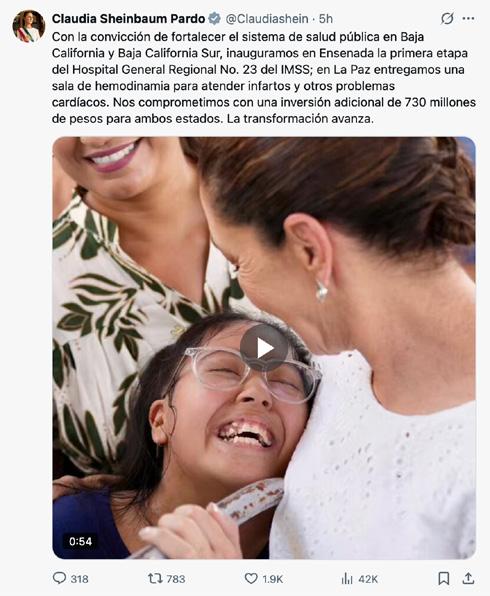 el programa Salud Casa por Casa, y en Guaymas, inauguró el Hospital Comunitario Vícam Switch, que beneficiará a más de 50 mil personas de los ocho pueblos Yaqui. También autorizó una inversión de 750 millones de pesos para reforzar los servicios de salud en el estado. En Ensenada, encabezó la inauguración de la primera etapa del Hospital General Regional No. 23 del IMSS, el cual dará atención a más de 318 mil derechohabientes. Además, anunció 430 millones de pesos adicionales para el sistema IMSS-Bienestar en la región. En La Paz, puso en marcha la nueva sala de hemodinamia del Hospital General IMSS-Bienestar, junto con una inversión complementaria de 300 millones de pesos.