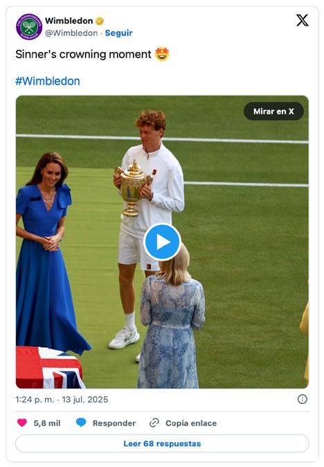 El español de 22 años, pierde su primera final de Grand Slam, tras haber ganado las cinco anteriores que había disputado, dos veces en Wimbledon, otras tantas en Roland Garros, y una en el US Open. Sinner, que cumplirá 24 años en agosto, logra de esta manera su cuarto título de Grand Slam, tras haber ganado antes dos veces el Abierto de Australia y una el US Open. En el palco, asistieron al triunfo de Sinner, el príncipe de Gales, Guillermo, heredero de la corona británica, junto a su esposa Catalina, y dos de los tres hijos de la pareja, Jorge y Carlota, además del rey de España, Felipe VI, y varios actores. Alcaraz aspiraba a convertirse en el quinto tenista en sumar tres Wimbledon consecutivos, tras el sueco Bjorn Borg, el estadounidense Pete Sampras, el suizo Roger Federer y el serbio Novak Djokovic.