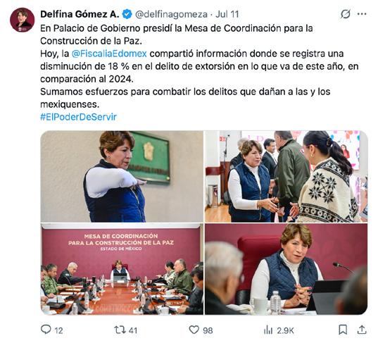 En el primer semestre de este 2025, el delito de extorsión mantiene una tendencia a la baja, la cual se registra desde el año 2023, como ejemplo, en este 2025, la disminución es de 18 por ciento, con base en datos de la Fiscalía General de Justicia del Estado de México (FGJEM), así lo informó la gobernadora, Delfina Gómez Álvarez. Al encabezar los trabajos de la Mesa de Coordinación para la Construcción de la Paz, la mandataria mexiquense revisó los avances que se registran en el combate de este delito.